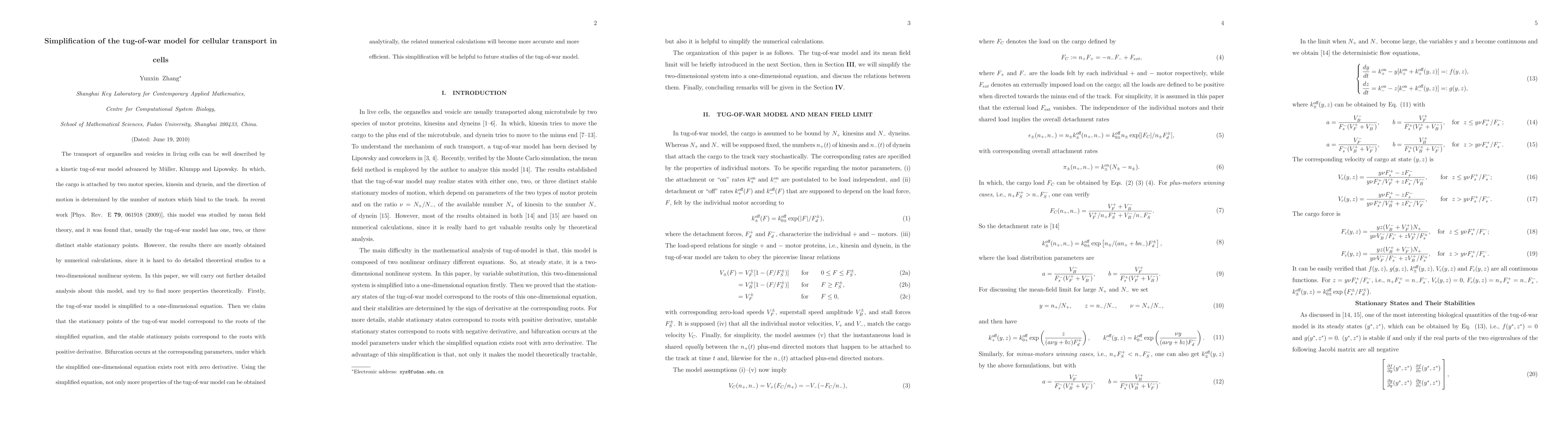 This paper simplifies the tug-of-war model for cellular transport by reducing it to a one-dimensional equation, allowing for analytical determination of stationary points and their stability. The simplification aids in understanding the model's behavior and improves the accuracy and efficiency of numerical calculations.