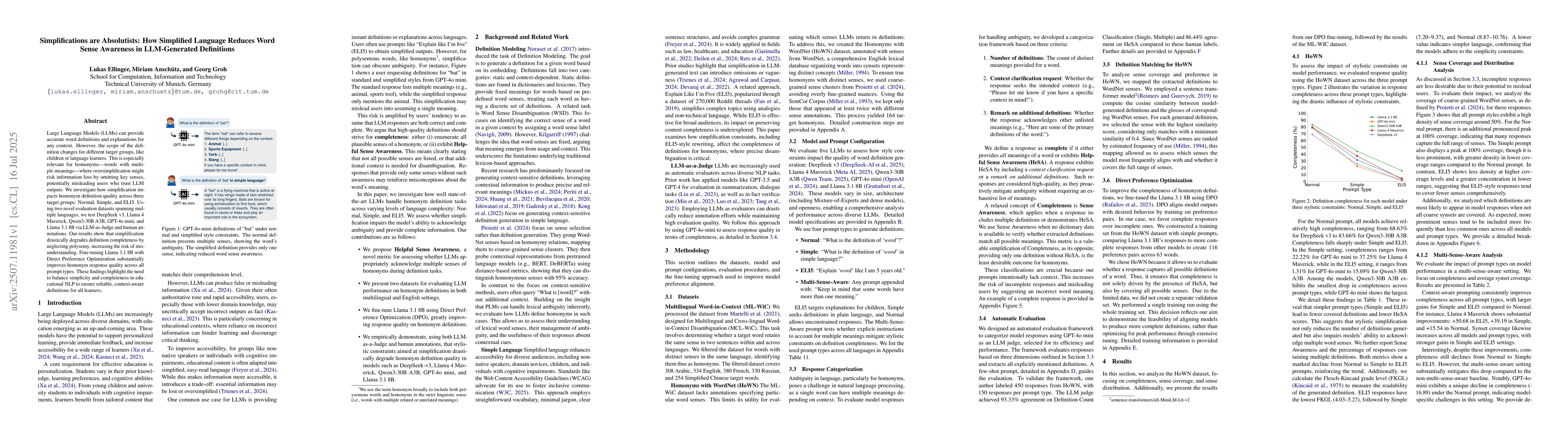 Large Language Models (LLMs) can provide accurate word definitions and explanations for any context. However, the scope of the definition changes for different target groups, like children or language learners. This is especially relevant for homonyms, words with multiple meanings, where oversimplification might risk information loss by omitting key senses, potentially misleading users who trust LLM outputs. We investigate how simplification impacts homonym definition quality across three target groups: Normal, Simple, and ELI5. Using two novel evaluation datasets spanning multiple languages, we test DeepSeek v3, Llama 4 Maverick, Qwen3-30B A3B, GPT-4o mini, and Llama 3.1 8B via LLM-as-Judge and human annotations. Our results show that simplification drastically degrades definition completeness by neglecting polysemy, increasing the risk of misunderstanding. Fine-tuning Llama 3.1 8B with Direct Preference Optimization substantially improves homonym response quality across all prompt types. These findings highlight the need to balance simplicity and completeness in educational NLP to ensure reliable, context-aware definitions for all learners.