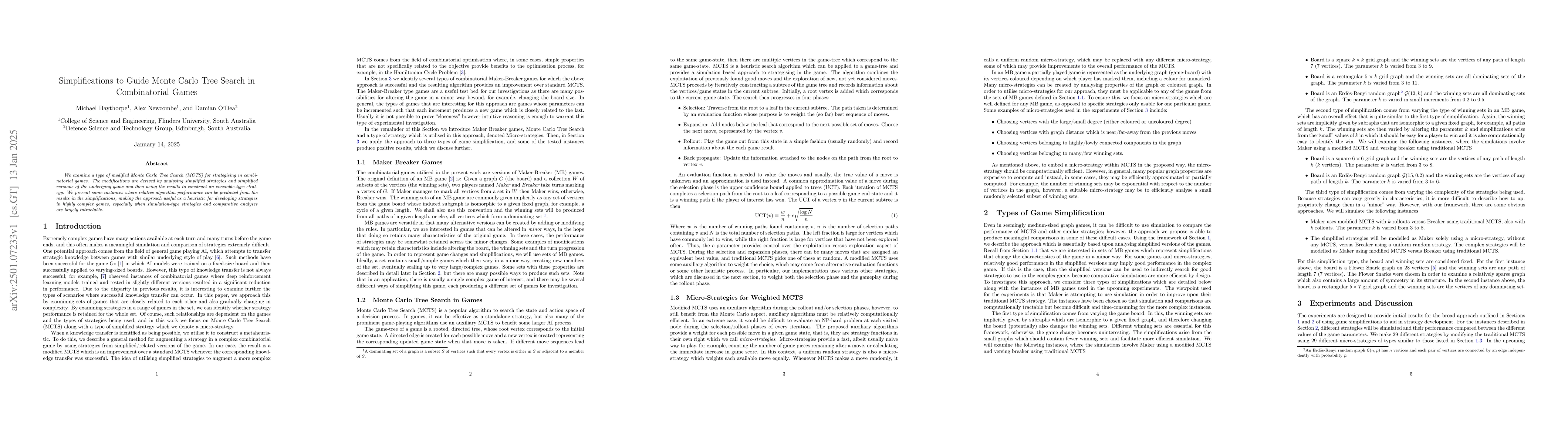 This paper proposes a modified Monte Carlo Tree Search (MCTS) strategy for combinatorial games, using simplified strategies and game versions to guide the search and predict algorithm performance, serving as a heuristic for complex games where traditional simulations are infeasible.