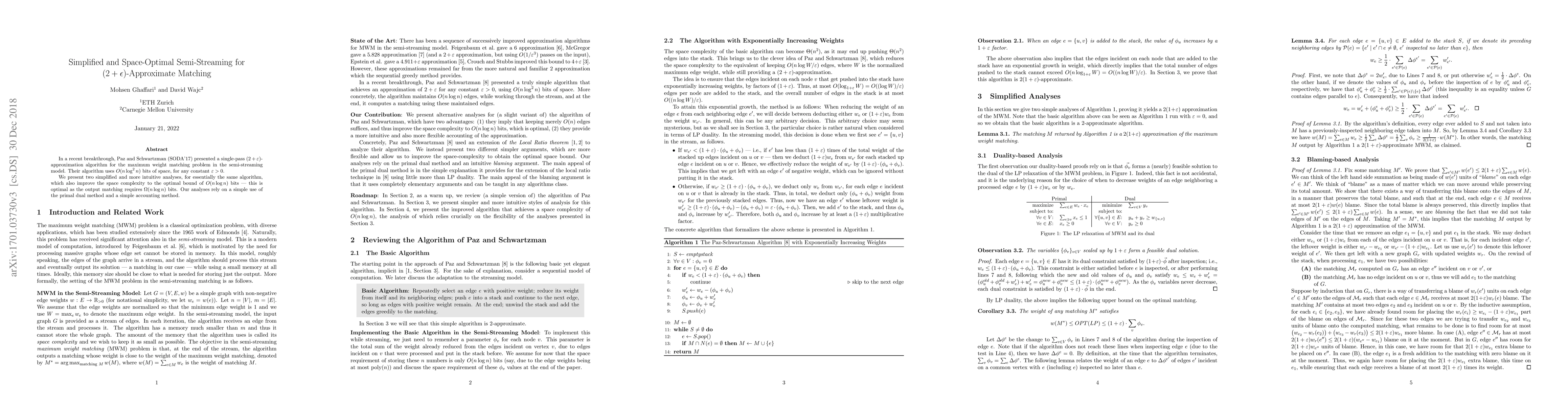 This paper simplifies and optimizes the space complexity of a semi-streaming algorithm for $(2+\epsilon)$-approximate matching, reducing it from $O(n\log^2 n)$ to the optimal $O(n\log n)$ bits, using intuitive primal-dual and accounting methods.
