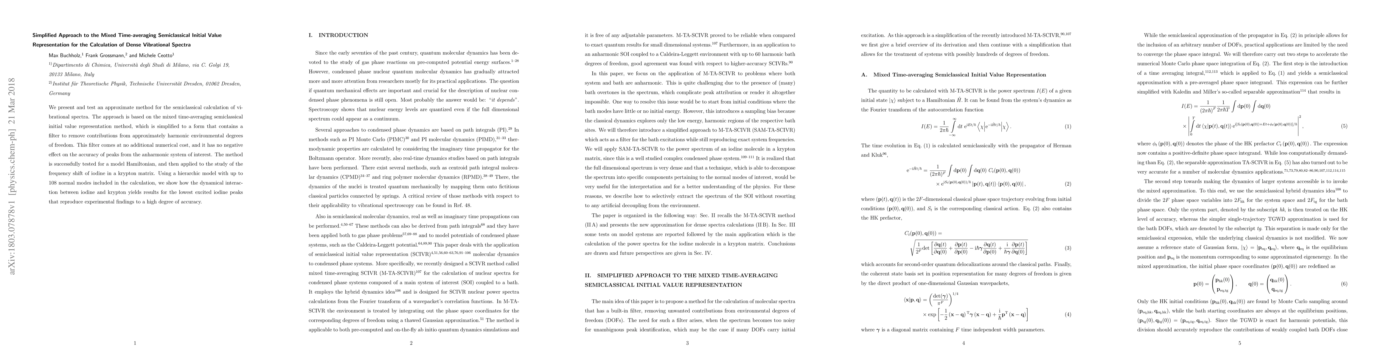 This paper introduces a simplified semiclassical method for calculating dense vibrational spectra, based on mixed time-averaging. The method incorporates a filter to exclude harmonic environmental contributions without compromising accuracy, and it accurately reproduces experimental findings for iodine in a krypton matrix.