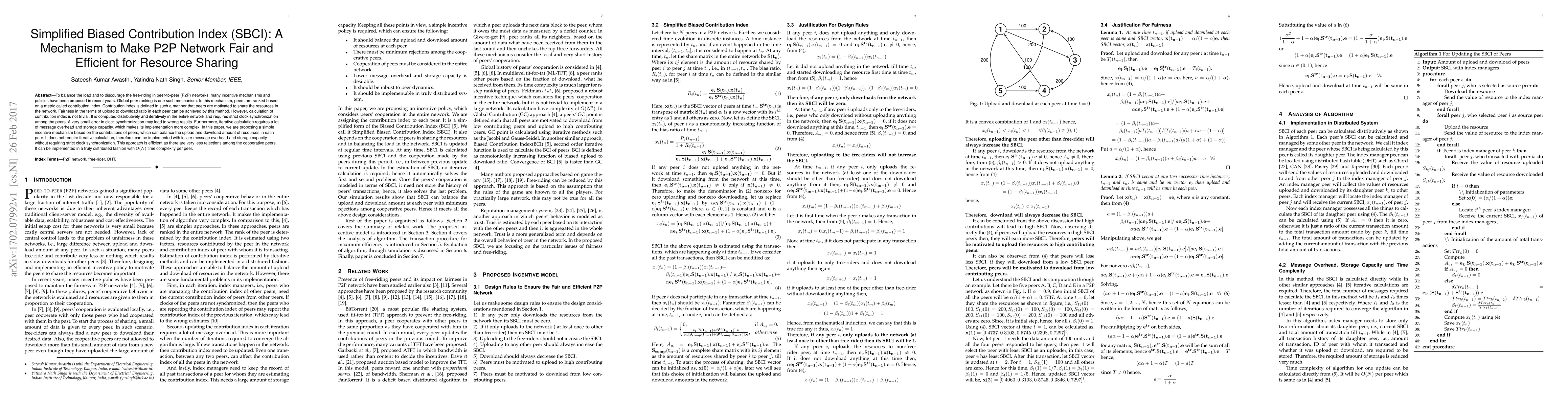 This paper proposes the Simplified Biased Contribution Index (SBCI) to balance resource sharing in P2P networks by incentivizing fair upload and download ratios without iterative calculations or strict clock synchronization, thus reducing message overhead and storage requirements. The SBCI mechanism achieves efficiency with $O(N)$ time complexity per peer.