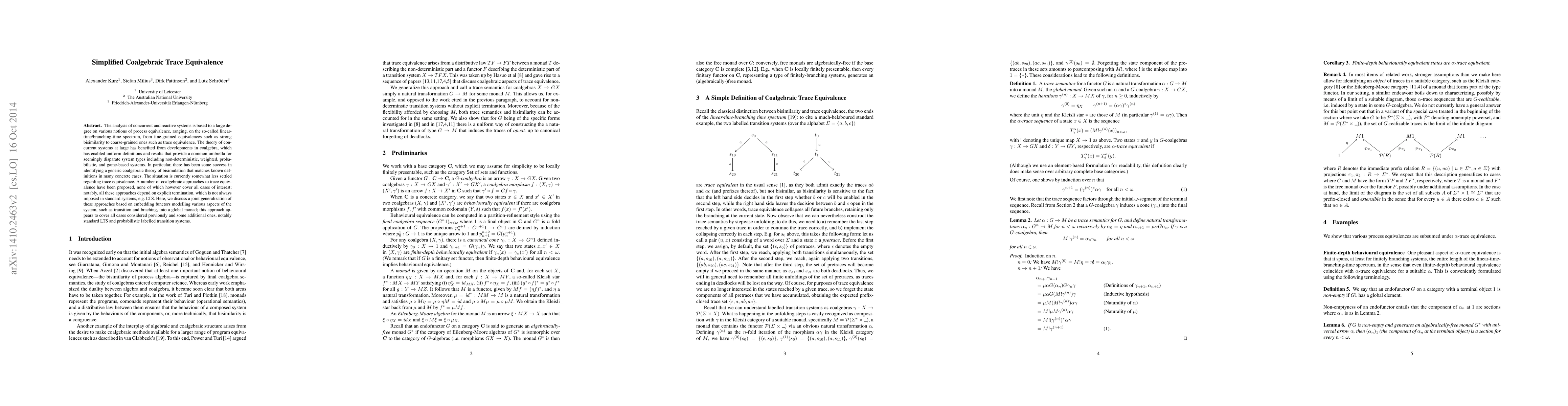 This paper proposes a simplified coalgebraic framework for trace equivalence in concurrent systems, generalizing existing approaches by embedding system aspects into a global monad, thus covering standard LTS and probabilistic labelled transition systems without requiring explicit termination.