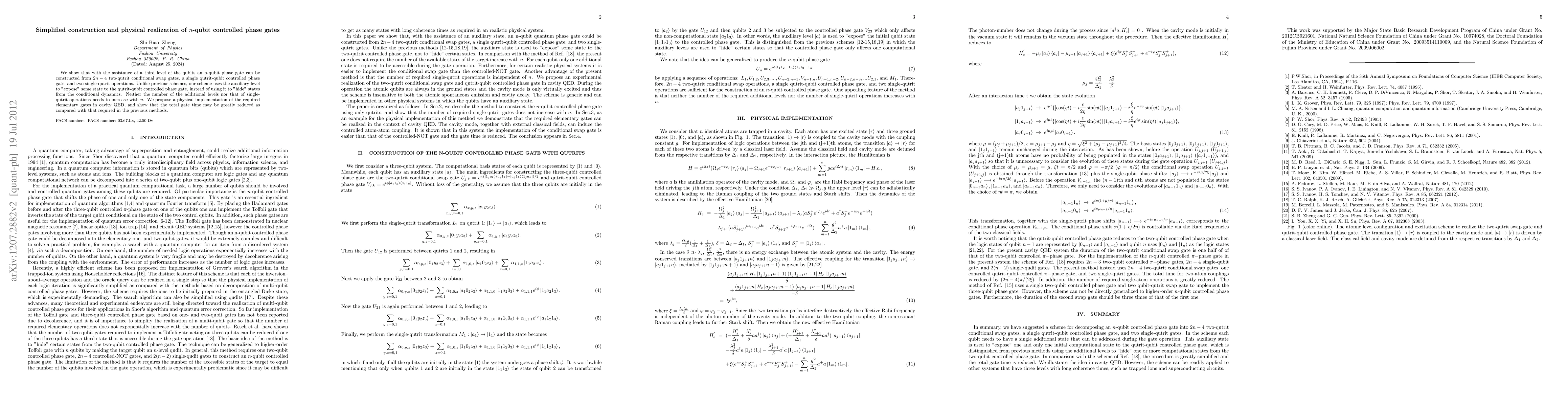 The paper presents a simplified method to construct n-qubit phase gates using 2n-4 two-qutrit conditional swap gates, one qutrit-qubit controlled phase gate, and two single-qutrit operations. This method reduces the need for additional qutrit levels and single-qutrit operations as n increases. A physical realization in cavity QED is proposed, significantly decreasing gate time compared to previous methods.