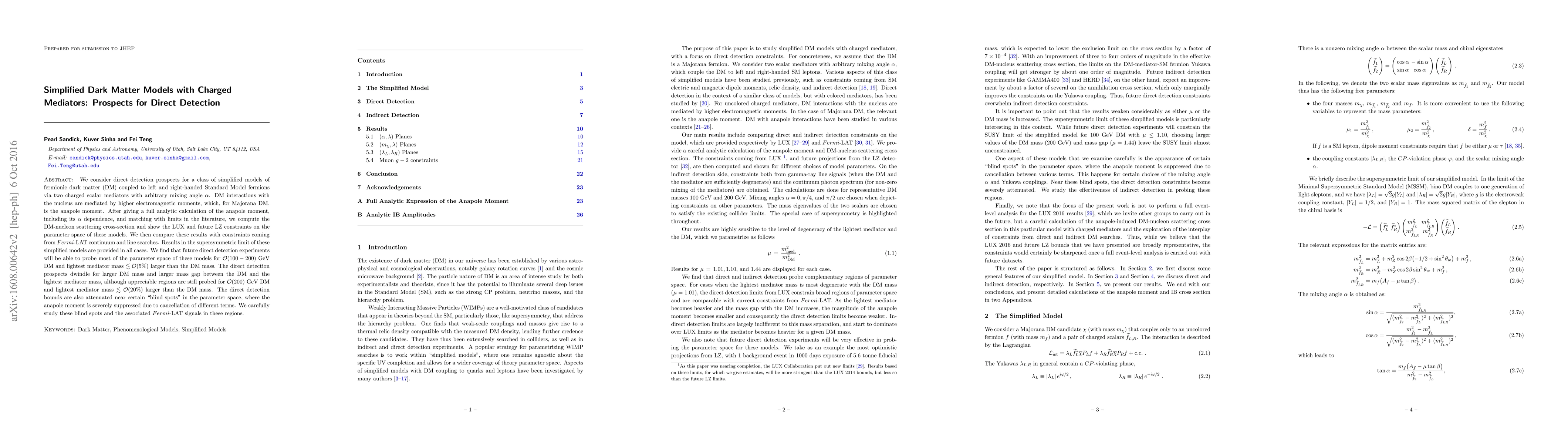 This paper explores simplified dark matter models with fermionic dark matter coupled via charged scalar mediators, focusing on direct detection prospects. It calculates the DM-nucleon scattering cross-section for Majorana DM, considering the anapole moment, and assesses constraints from LUX, LZ, and Fermi-LAT. Future direct detection experiments are projected to probe most parameter space for DM masses around 100-200 GeV, with mediator masses slightly larger, though larger DM masses and mass gaps reduce detection prospects.