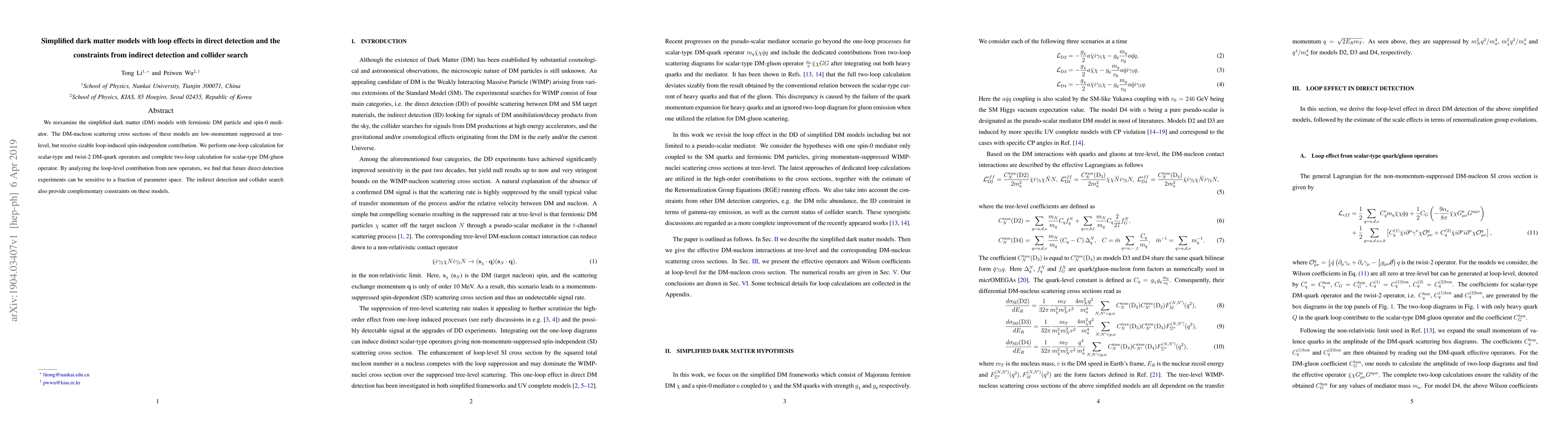 We reexamine the simplified dark matter (DM) models with fermionic DM particle and spin-0 mediator. The DM-nucleon scattering cross sections of these models are low-momentum suppressed at tree-level, but receive sizable loop-induced spin-independent contribution. We perform one-loop calculation for scalar-type and twist-2 DM-quark operators and complete two-loop calculation for scalar-type DM-gluon operator. By analyzing the loop-level contribution from new operators, we find that future direct detection experiments can be sensitive to a fraction of parameter space. The indirect detection and collider search also provide complementary constraints on these models.