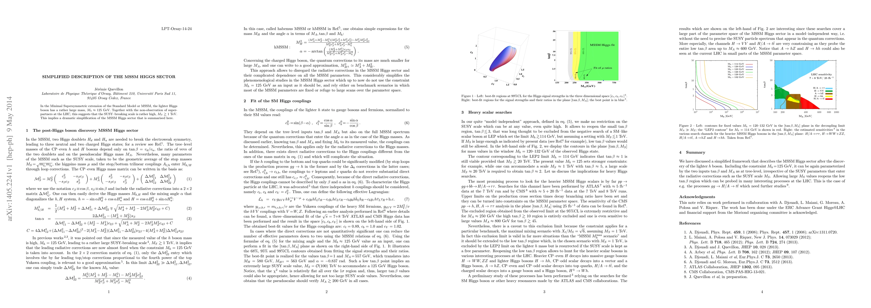 This paper summarizes the simplified structure of the MSSM Higgs sector, noting that the lighter Higgs boson's mass of approximately 125 GeV, coupled with the absence of superpartners at the LHC, suggests a high SUSY-breaking scale, leading to a streamlined MSSM Higgs sector.