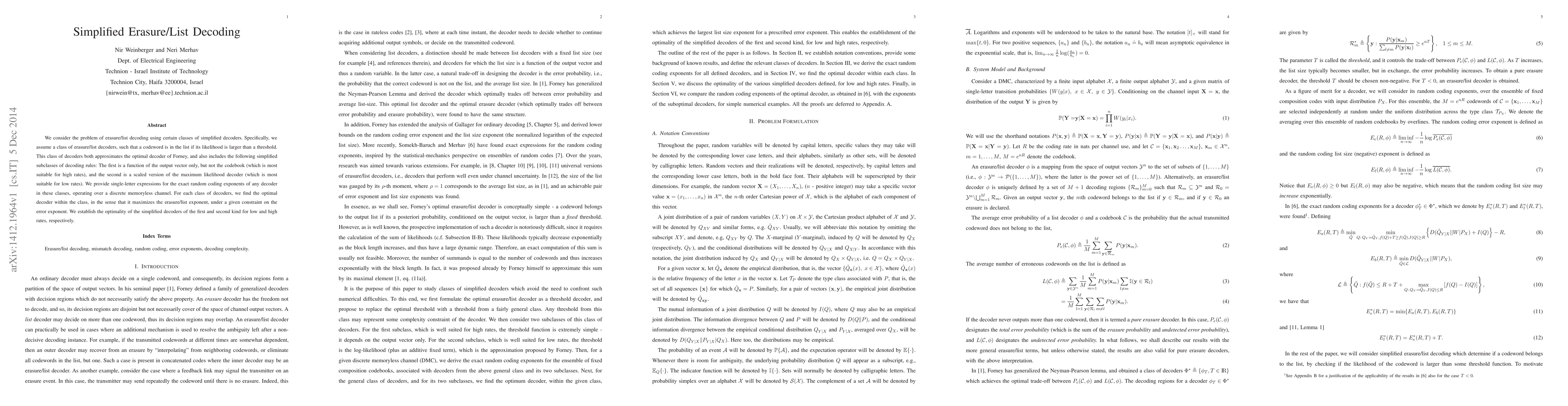 This paper investigates erasure/list decoding using simplified decoders that approximate the optimal Forney decoder. It introduces two subclasses: one based solely on output vectors for high rates and another scaled maximum likelihood decoder for low rates, providing their respective optimal forms and random coding exponents for discrete memoryless channels.