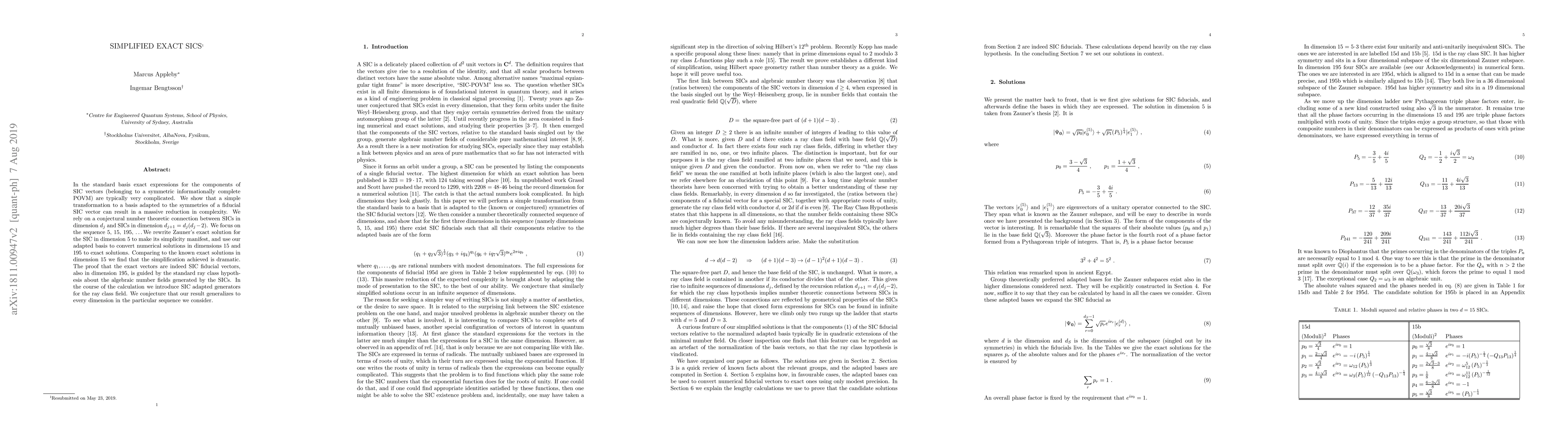 This paper presents a simplified method to express components of SIC vectors using an adapted basis, significantly reducing complexity. The approach leverages a conjectured number theory link between SIC dimensions, demonstrating dramatic simplification in dimensions 5, 15, and 195, with the proof guided by the ray class hypothesis.