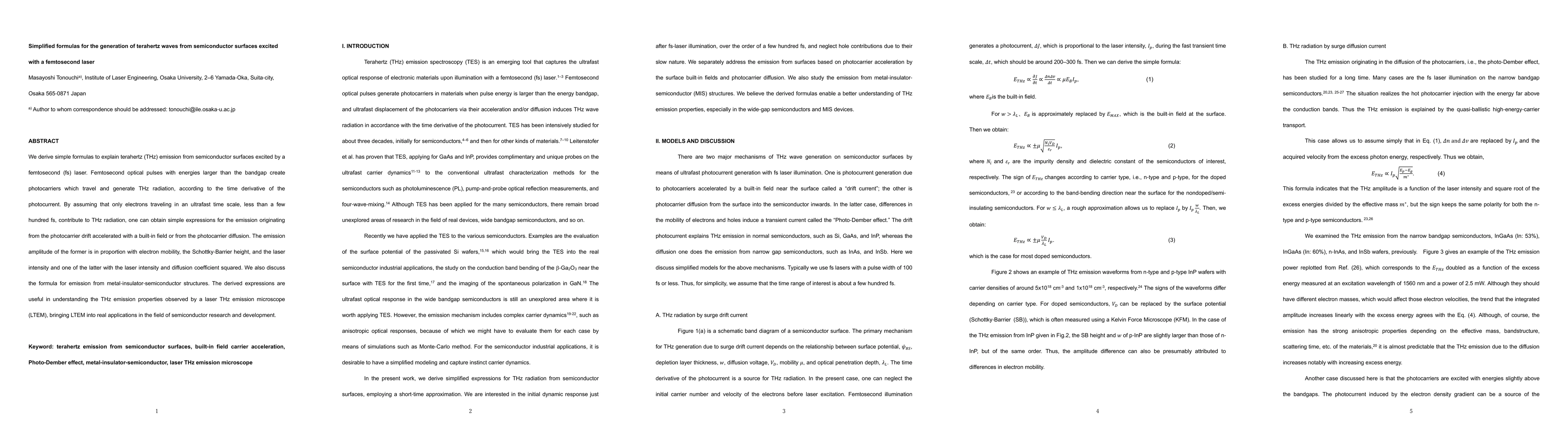 This paper derives simplified formulas for terahertz wave generation from semiconductor surfaces excited by femtosecond lasers, explaining THz emission via photocarrier drift and diffusion. The study provides practical expressions for THz emission properties, enhancing the application of laser THz emission microscopy in semiconductor research.