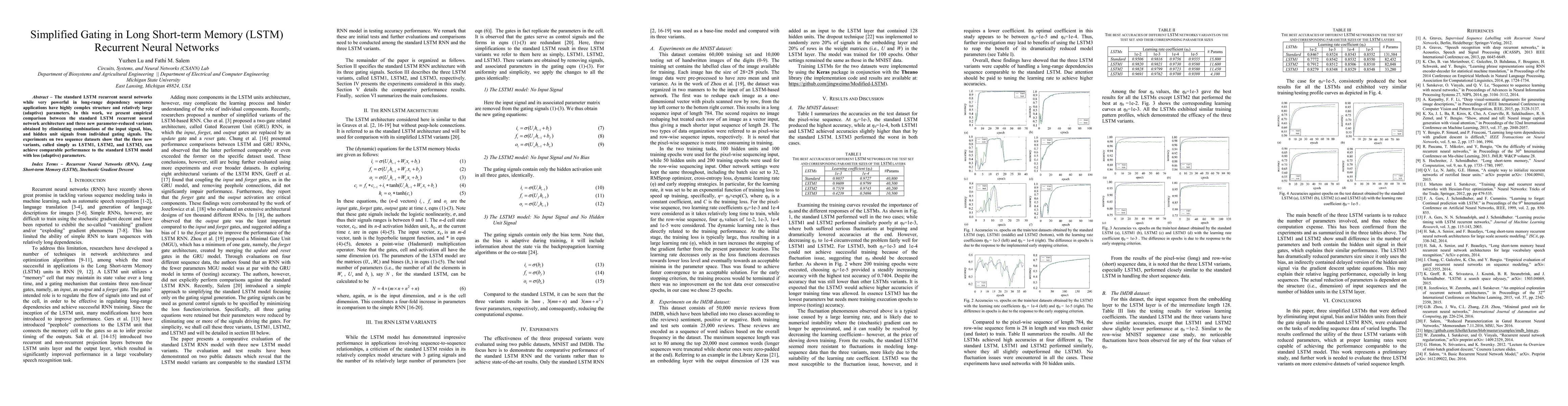 This paper proposes simplified variants of LSTM networks (LSTM1, LSTM2, and LSTM3) by reducing parameters through gating signal modifications. Experiments demonstrate that these variants achieve comparable performance to the standard LSTM with fewer parameters.