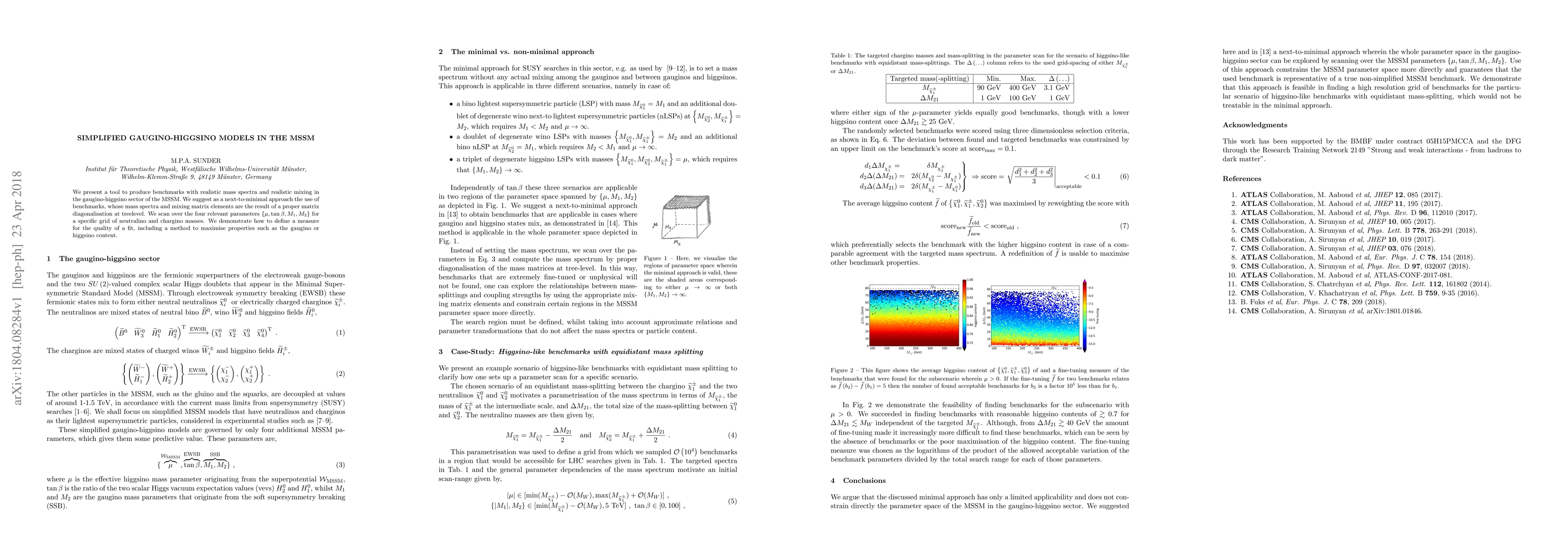 The paper presents a tool for generating benchmark models with realistic mass spectra and mixing in the gaugino-higgsino sector of the MSSM. It suggests an 'next-to-minimal' approach, scanning over four parameters {µ, tan β, M1, M2} for specific neutralino and chargino mass grids, ensuring a proper matrix diagonalization at tree-level.