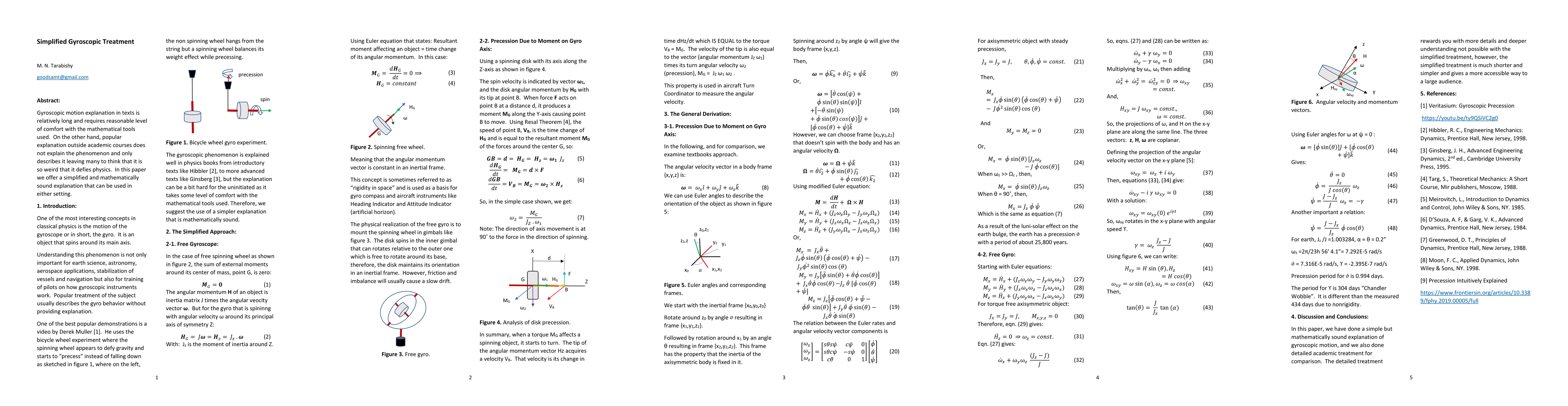 Gyroscopic motion explanation in texts is relatively long and requires reasonable level of comfort with the mathematical tools used. On the other hand, popular explanation outside academic courses does not explain the phenomenon and only describes it leaving many to think that it is so weird that it defies physics. In this paper we offer a simplified and mathematically sound explanation that can be used in either setting.