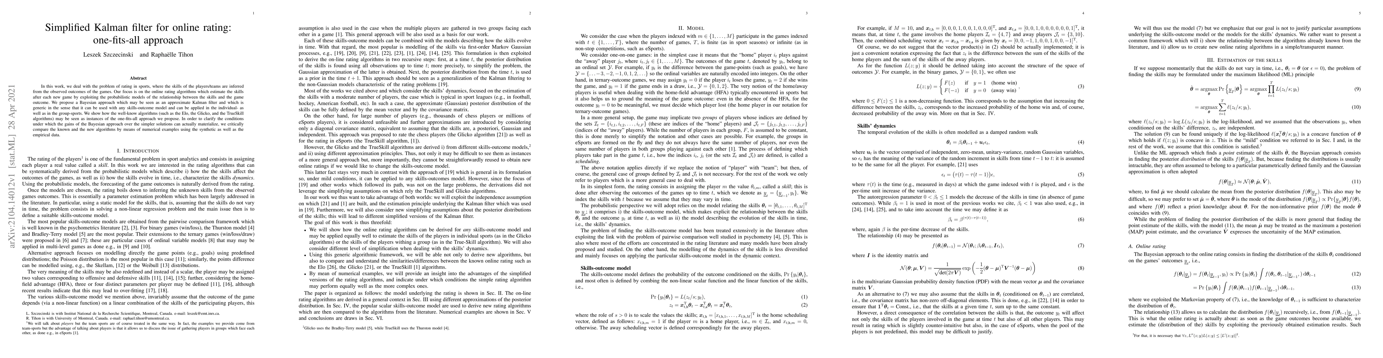 In this work, we deal with the problem of rating in sports, where the skills of the players/teams are inferred from the observed outcomes of the games. Our focus is on the online rating algorithms which estimate the skills after each new game by exploiting the probabilistic models of the relationship between the skills and the game outcome. We propose a Bayesian approach which may be seen as an approximate Kalman filter and which is generic in the sense that it can be used with any skills-outcome model and can be applied in the individual -- as well as in the group-sports. We show how the well-know algorithms (such as the Elo, the Glicko, and the TrueSkill algorithms) may be seen as instances of the one-fits-all approach we propose. In order to clarify the conditions under which the gains of the Bayesian approach over the simpler solutions can actually materialize, we critically compare the known and the new algorithms by means of numerical examples using the synthetic as well as the empirical data.