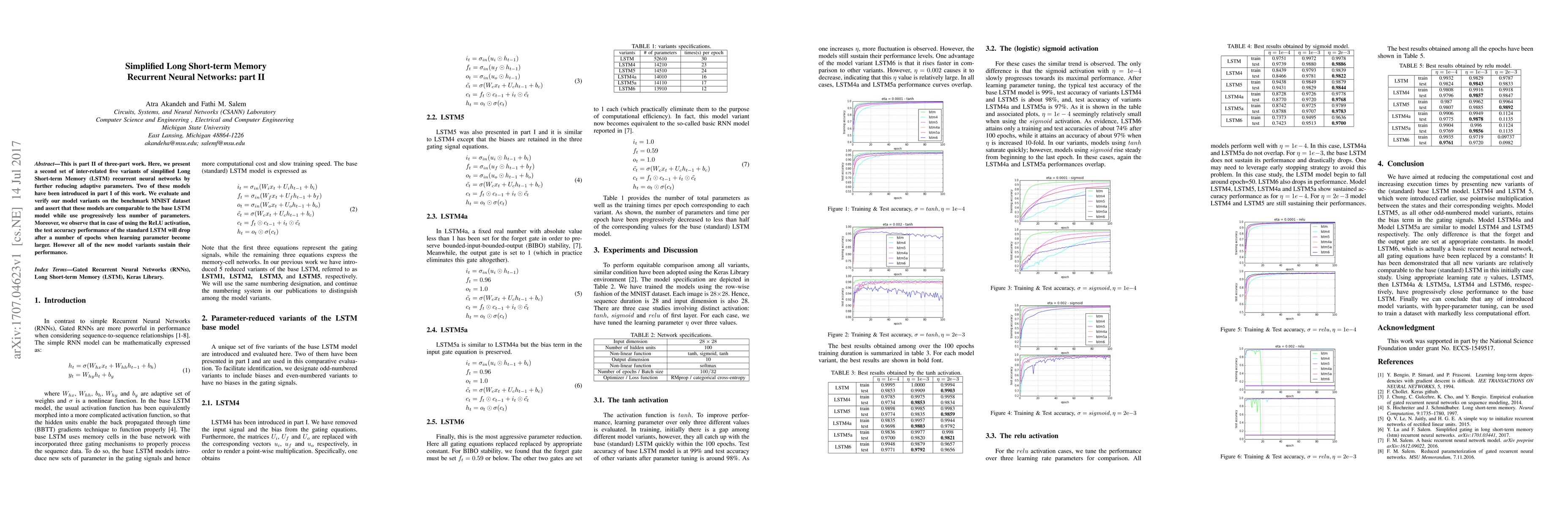 This paper introduces five new variants of simplified Long Short-term Memory (LSTM) networks, reducing adaptive parameters further. Evaluated on the MNIST dataset, these models show comparable performance to the base LSTM while using fewer parameters, and unlike the standard LSTM, they maintain accuracy even with larger learning parameters.