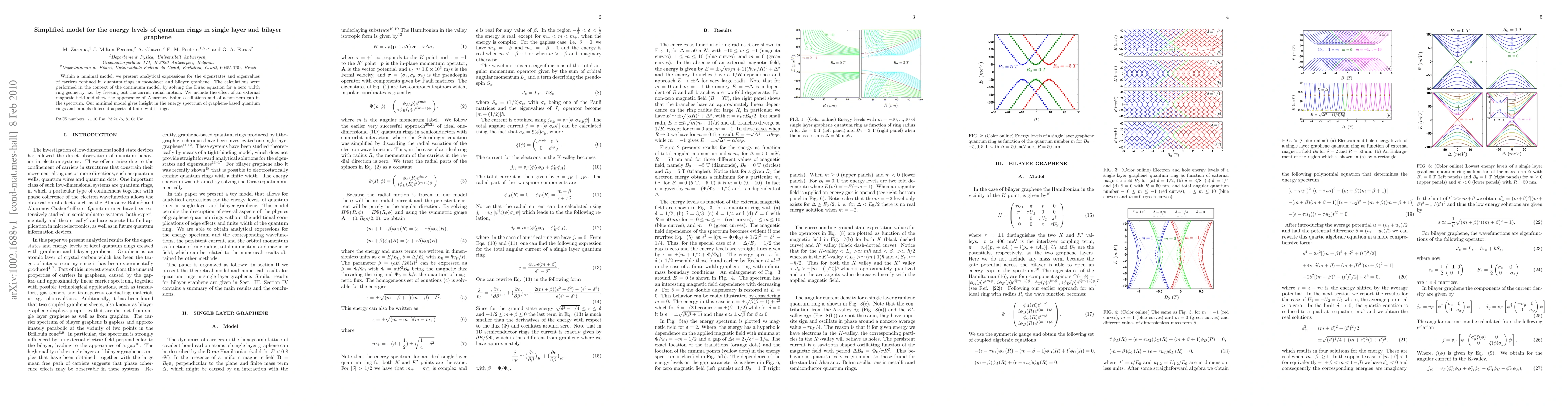 This paper presents an analytical model for the energy levels of carriers in quantum rings within monolayer and bilayer graphene, showing Aharonov-Bohm oscillations and a non-zero energy gap under an external magnetic field. The simplified model provides insights into the spectrum of graphene-based quantum rings.
