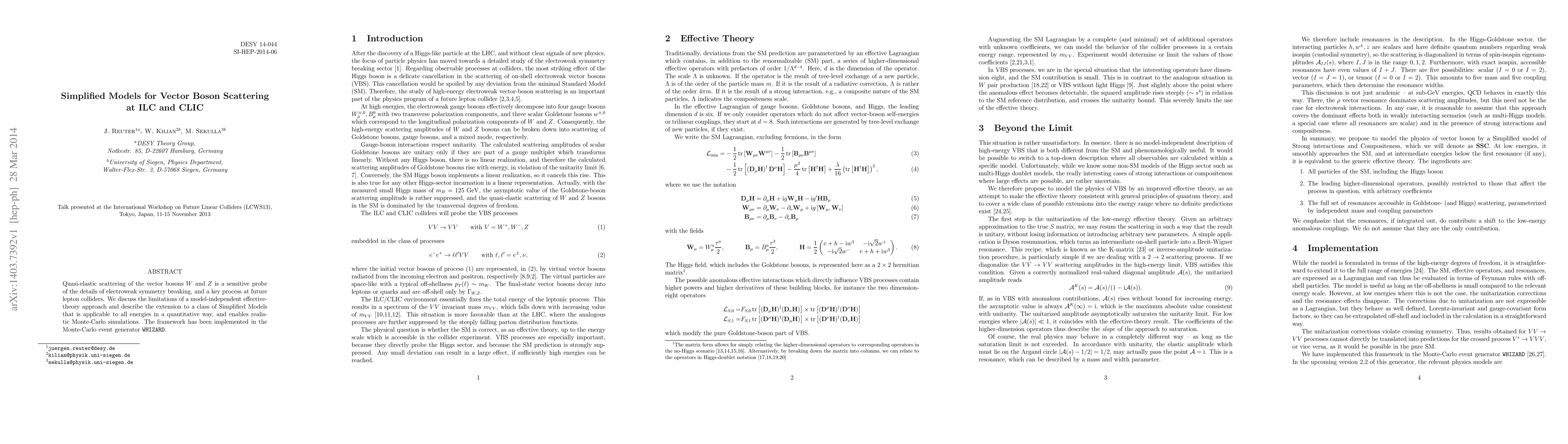 Quasi-elastic scattering of the vector bosons W and Z is a sensitive probe of the details of electroweak symmetry breaking, and a key process at future lepton colliders. We discuss the limitations of a model-independent effective-theory approach and describe the extension to a class of Simplified Models that is applicable to all energies in a quantitative way, and enables realistic Monte-Carlo simulations. The framework has been implemented in the Monte-Carlo event generator WHIZARD.