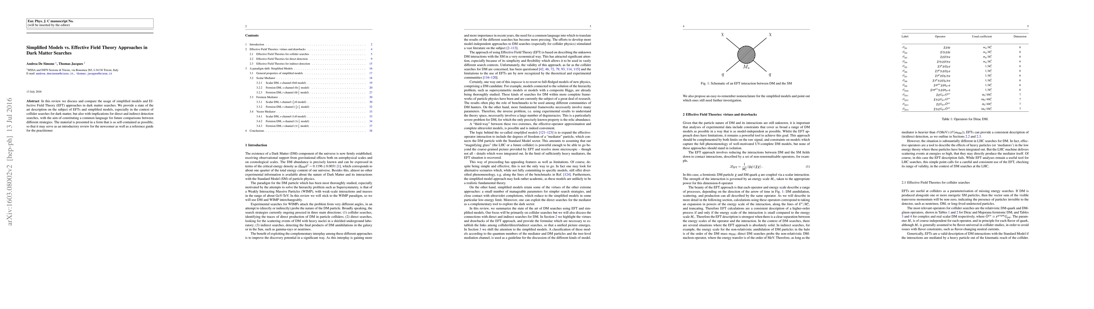 This review compares simplified models to Effective Field Theory approaches in dark matter searches, aiming to establish a common language for future comparisons between different strategies. It provides a state-of-the-art description of EFTs and simplified models for various dark matter search methods.