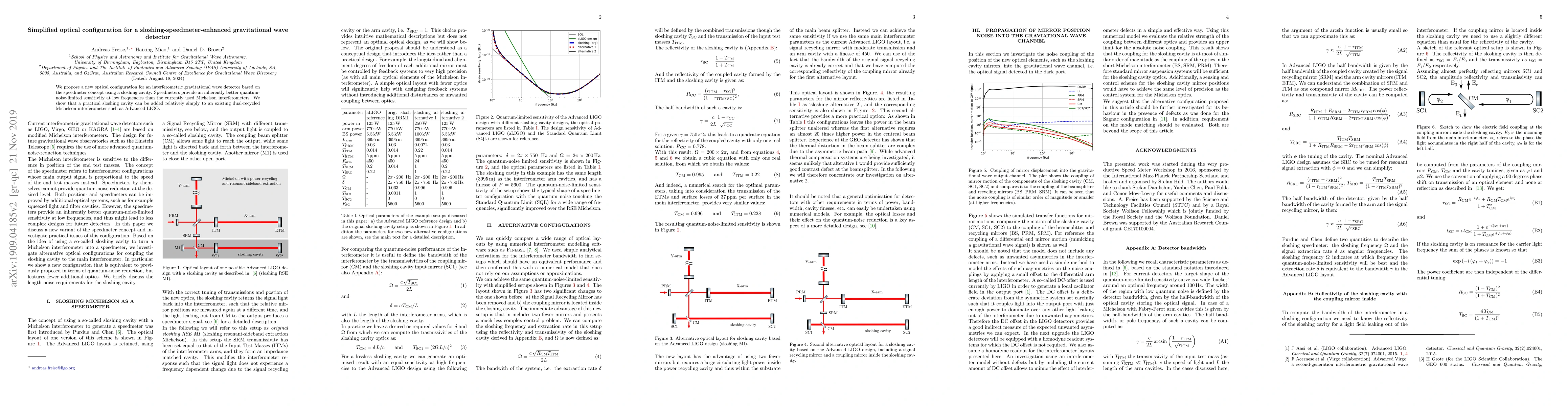 This paper proposes a simplified optical configuration for enhancing gravitational wave detectors using a sloshing cavity speedmeter, which offers improved sensitivity at low frequencies compared to traditional Michelson interferometers. The new setup can be integrated with existing dual-recycled Michelson interferometers like Advanced LIGO with minimal modifications.