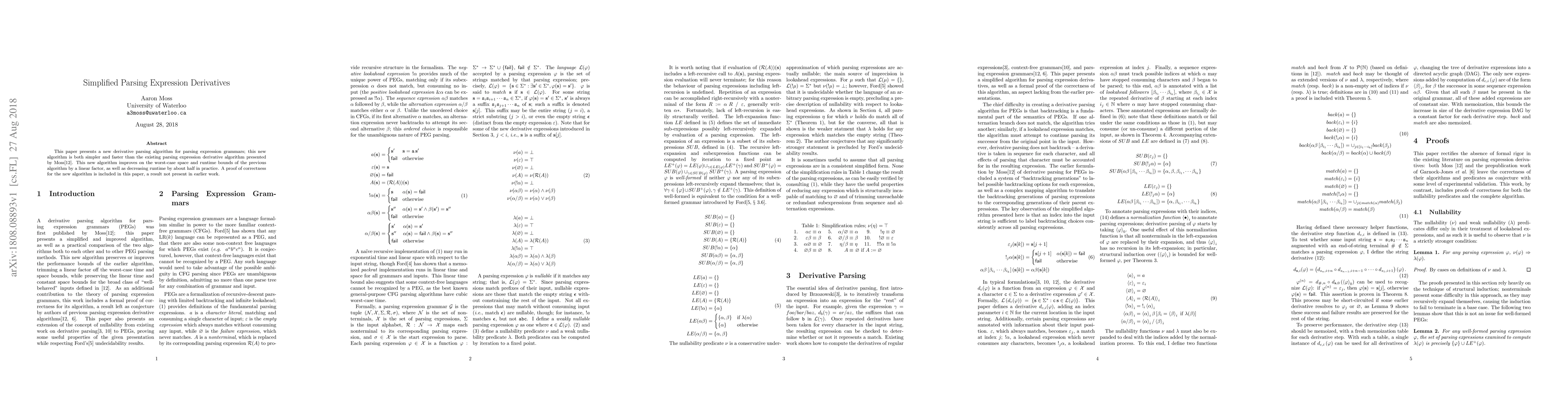 This paper introduces a new, simpler, and faster parsing expression derivative algorithm that improves upon Moss's previous work, reducing both space and runtime by a linear factor and achieving a practical runtime decrease of about half, with a correctness proof provided.