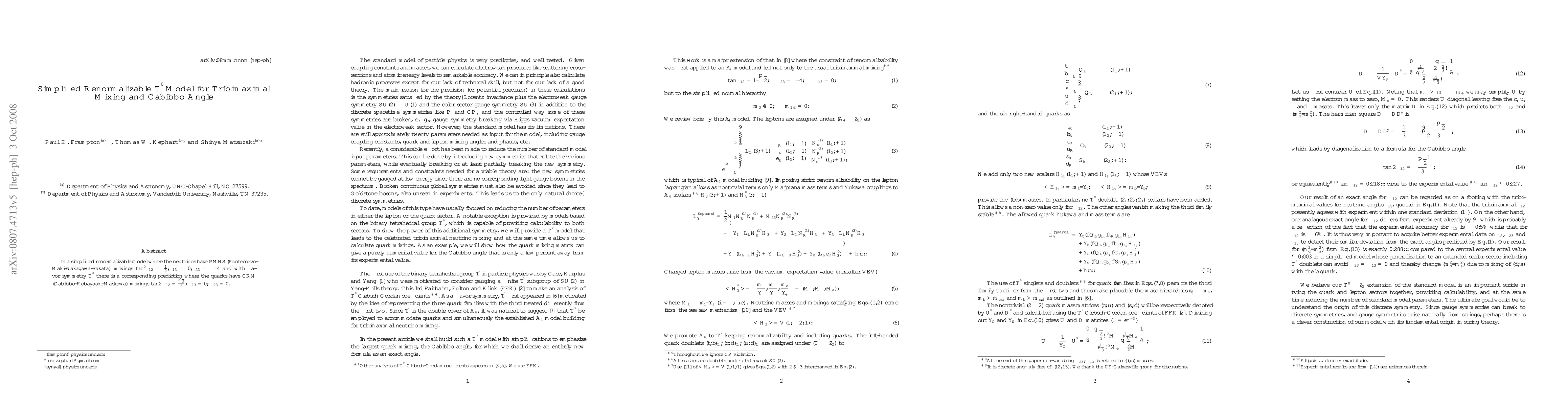 The paper proposes a simplified renormalizable $T^{'}$ model predicting tribimaximal neutrino mixing and specific Cabibbo-Kobayashi-Maskawa (CKM) quark mixing angles. It establishes a connection between Pontecivo-Maki-Nakagawa-Sakata (PMNS) neutrino mixing and CKM quark mixing.