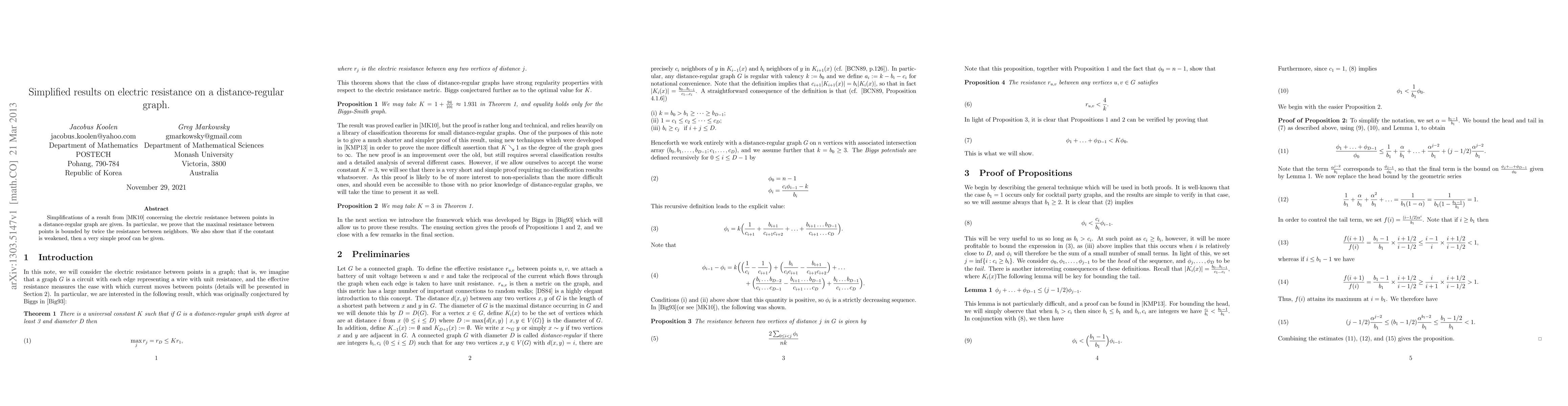 Summary: This paper simplifies results on electric resistance in distance-regular graphs, proving that the maximal resistance between points is at most twice the resistance between neighbors. A straightforward proof is provided when the constant is relaxed.