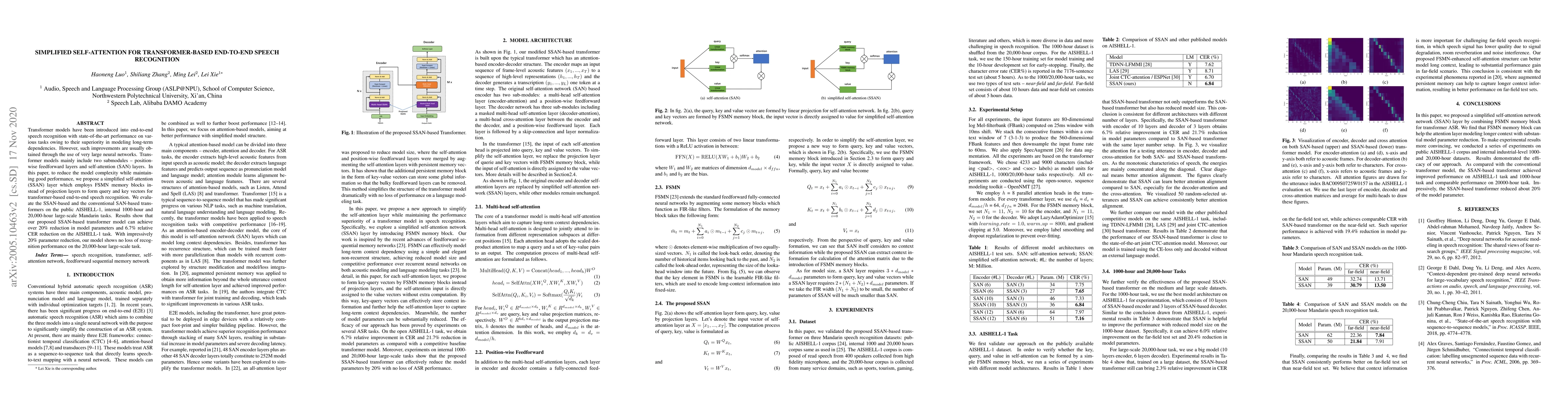 This paper proposes a simplified self-attention layer (SSAN) using FSMN memory blocks to reduce the complexity of transformer models for end-to-end speech recognition while maintaining performance. The SSAN-based transformer achieved over 20% parameter reduction and a 6.7% relative CER reduction on the AISHELL-1 task, demonstrating effective simplification without performance loss.