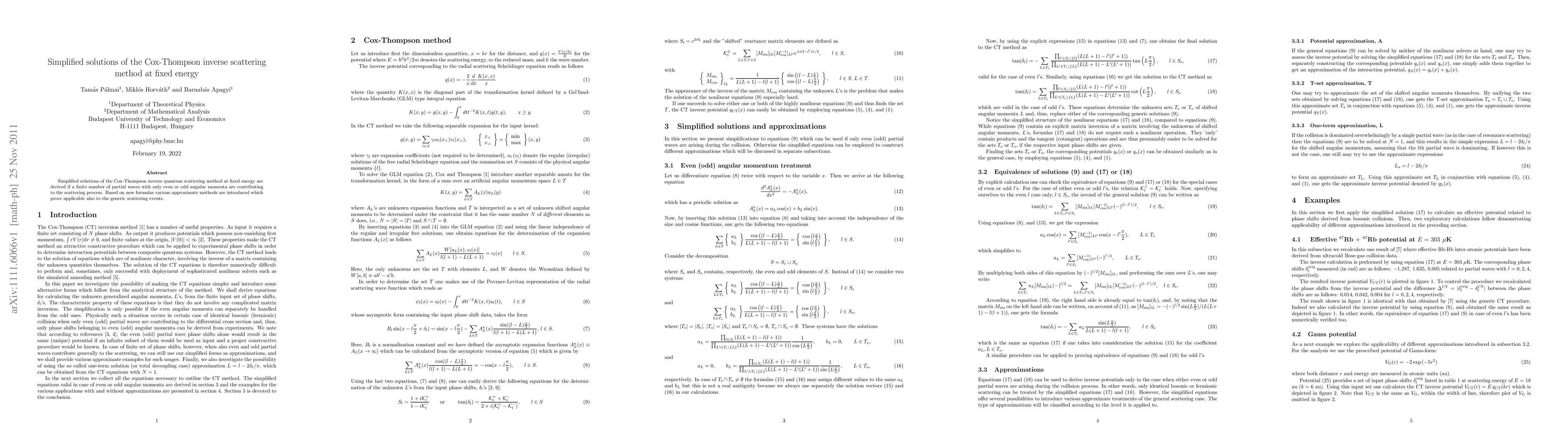 This paper derives simplified solutions for the Cox-Thompson inverse scattering method at fixed energy, focusing on scenarios where only even or odd angular momenta contribute. It introduces new approximate methods applicable to general scattering events.