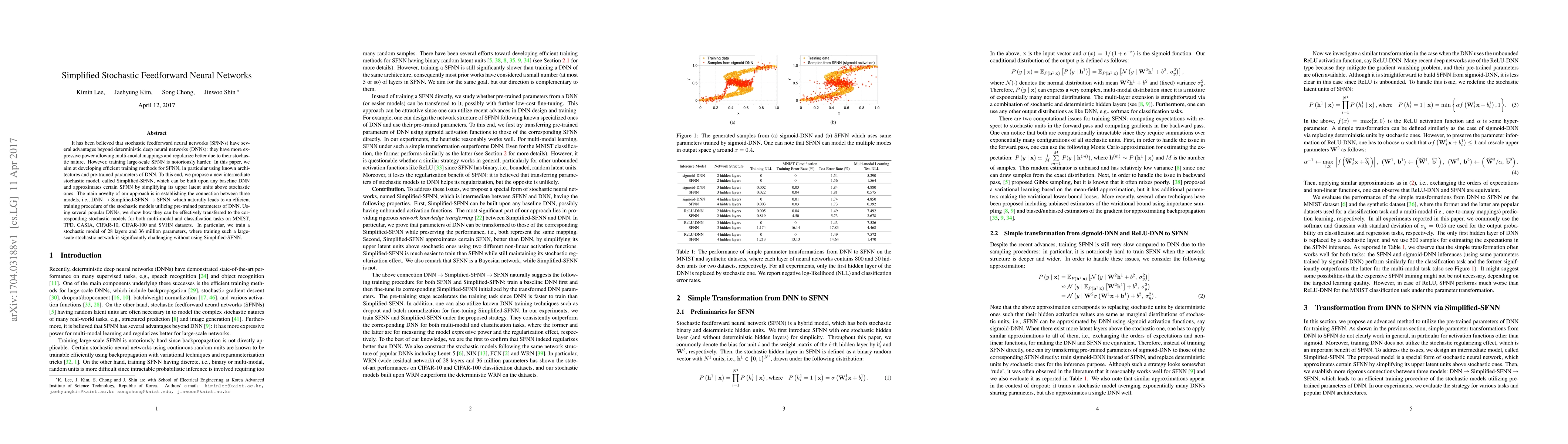 It has been believed that stochastic feedforward neural networks (SFNNs) have several advantages beyond deterministic deep neural networks (DNNs): they have more expressive power allowing multi-modal mappings and regularize better due to their stochastic nature. However, training large-scale SFNN is notoriously harder. In this paper, we aim at developing efficient training methods for SFNN, in particular using known architectures and pre-trained parameters of DNN. To this end, we propose a new intermediate stochastic model, called Simplified-SFNN, which can be built upon any baseline DNNand approximates certain SFNN by simplifying its upper latent units above stochastic ones. The main novelty of our approach is in establishing the connection between three models, i.e., DNN->Simplified-SFNN->SFNN, which naturally leads to an efficient training procedure of the stochastic models utilizing pre-trained parameters of DNN. Using several popular DNNs, we show how they can be effectively transferred to the corresponding stochastic models for both multi-modal and classification tasks on MNIST, TFD, CASIA, CIFAR-10, CIFAR-100 and SVHN datasets. In particular, we train a stochastic model of 28 layers and 36 million parameters, where training such a large-scale stochastic network is significantly challenging without using Simplified-SFNN