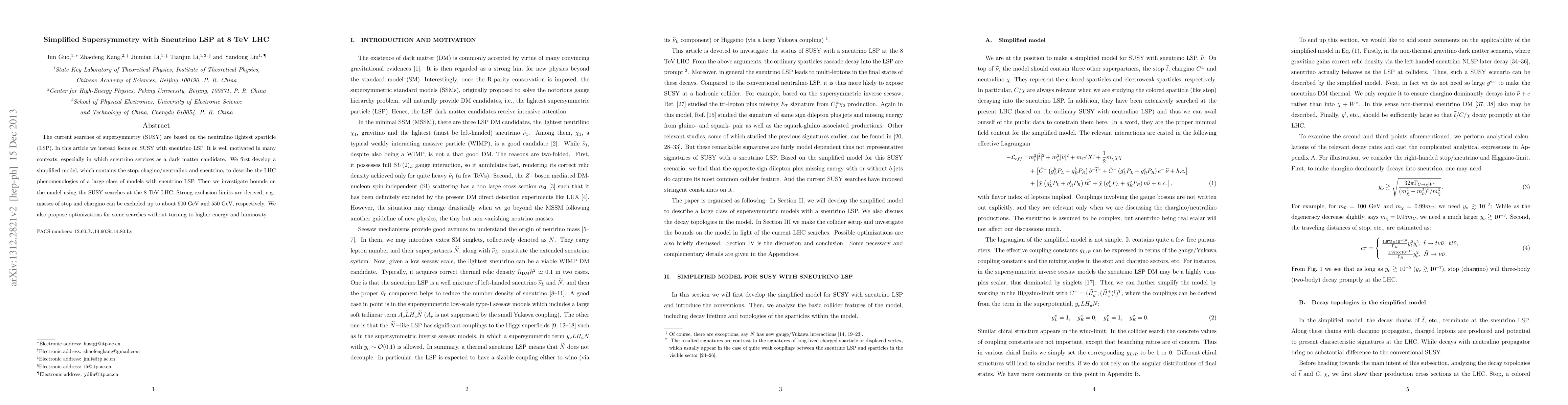 This paper explores supersymmetry (SUSY) with a sneutrino as the lightest supersymmetric particle (LSP) instead of the neutralino, proposing a simplified model that includes the stop, chargino/neutralino, and sneutrino. It investigates the exclusion limits from the 8 TeV LHC, finding significant constraints on stop and chargino masses, and suggests search optimizations for future studies.