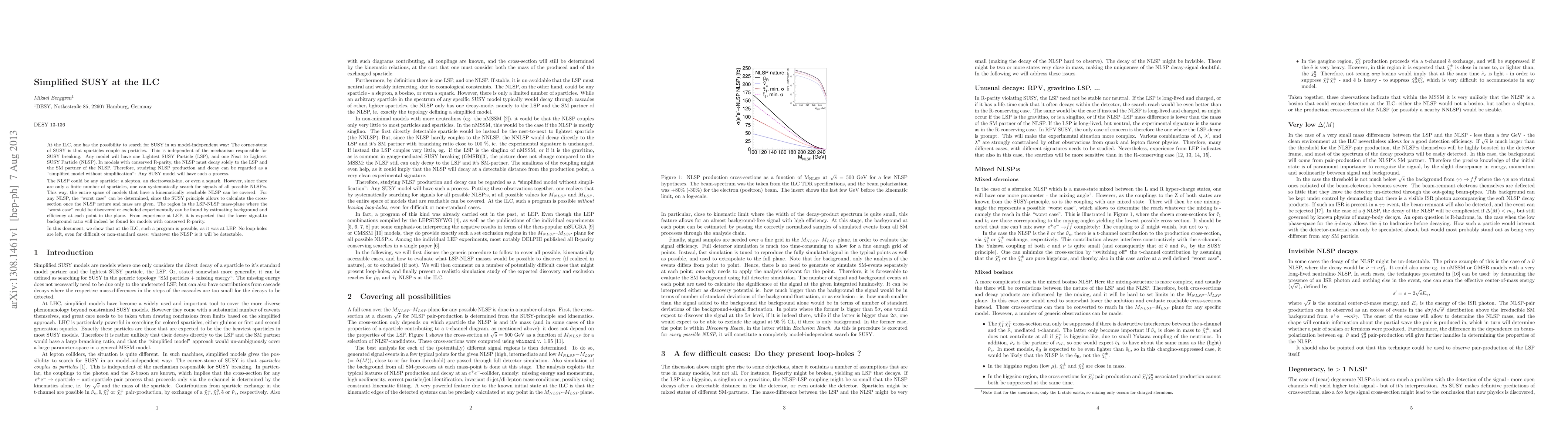 At the ILC, one has the possibility to search for SUSY in an model-independent way: The corner-stone of SUSY is that sparticles couple as particles. This is independent of the mechanism responsible for SUSY breaking. Any model will have one Lightest SUSY Particle (LSP), and one Next to Lightest SUSY Particle (NLSP). In models with conserved R-parity, the NLSP must decay solely to the LSP and the SM partner of the NLSP. Therefore, studying NLSP production and decay can be regarded as a "simplified model without simplification": Any SUSY model will have such a process. The NLSP could be any sparticle: a slepton, an electroweak-ino, or even a squark. However, since there are only a finite number of sparticles, one can systematically search for signals of all possible NLSP:s. This way, the entire space of models that have a kinematicall y reachable NLSP can be covered. For any NLSP, the "worst case" can be determined, since the SUSY principle allows to calculate the cross-section once the NLSP nature and mass are given. The region in the LSP-NLSP mass-plane where the "worst case" could be discovered or excluded experimentally can be found by estimating background and efficiency at each point in the plane. From experience at LEP, it is expected that the lower signal-to background ratio will indeed be found for models with conserved R-parity. In this document, we show that at the ILC, such a program is possible, as it was at LEP. No loop-holes are left, even for difficult or non-standard cases: whatever the NLSP is it will be detectable.