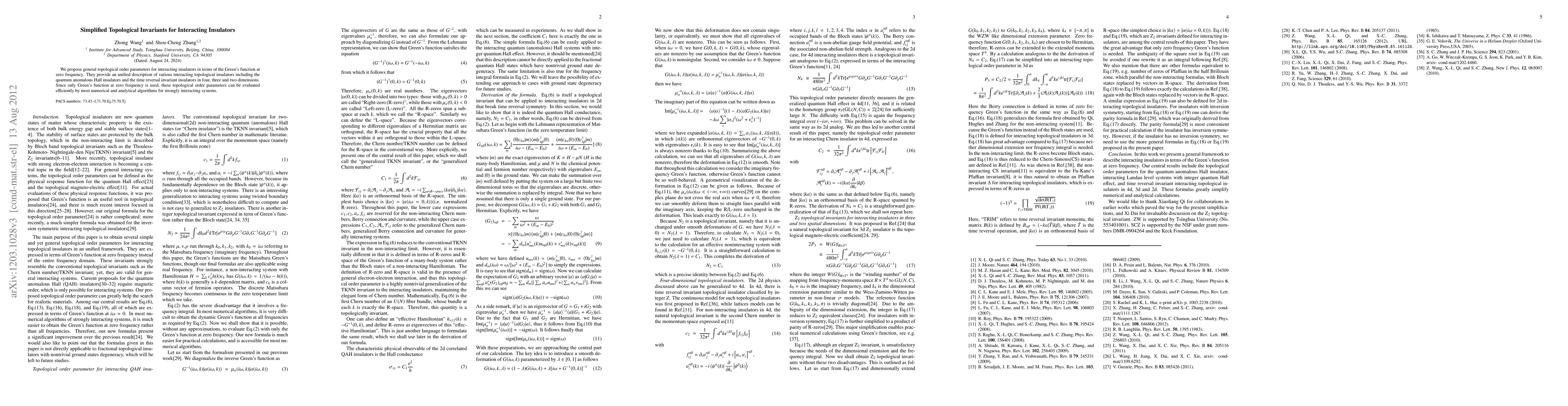 This paper introduces simplified topological invariants for interacting insulators, expressed in terms of zero-frequency Green's functions, providing a unified description for various topological insulators across different dimensions. These new parameters can be efficiently evaluated using standard numerical and analytical methods.
