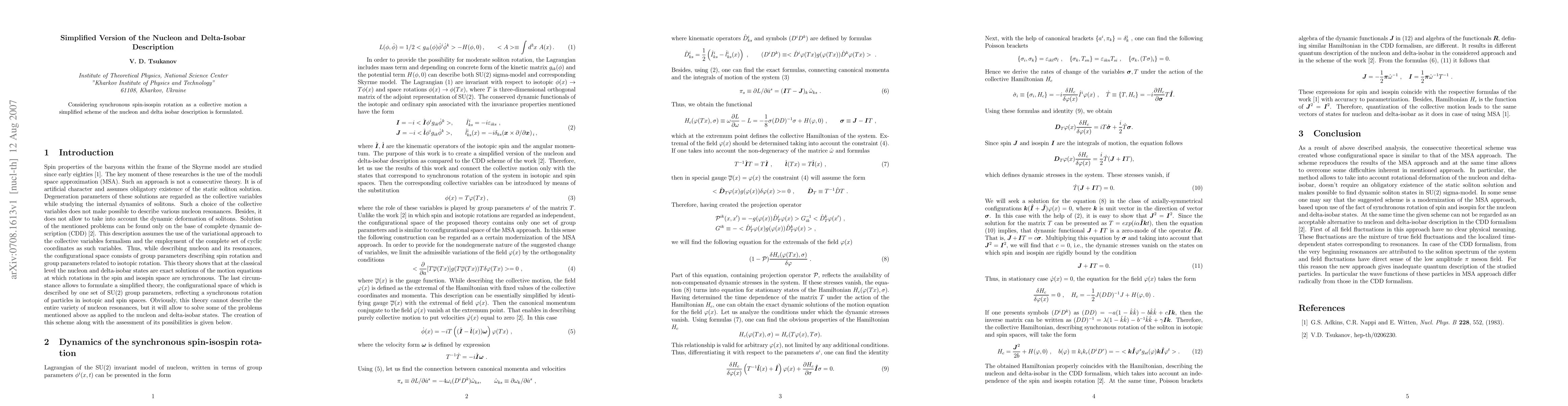 Considering synchronous spin-isospin rotation as a collective motion a simplified scheme of the nucleon and delta isobar description is formulated.