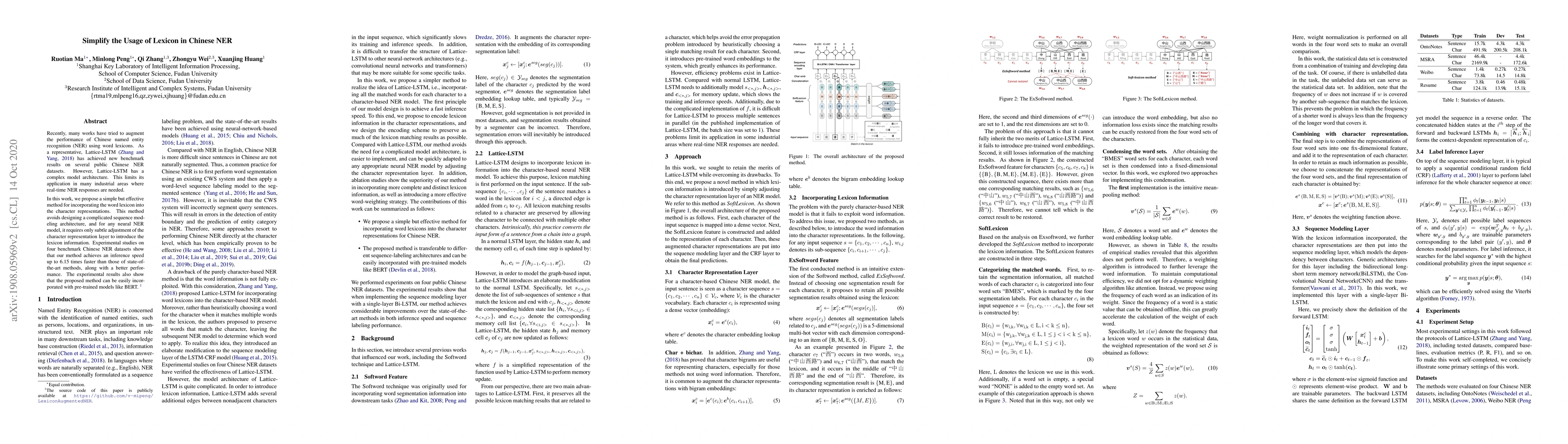 Recently, many works have tried to augment the performance of Chinese named entity recognition (NER) using word lexicons. As a representative, Lattice-LSTM (Zhang and Yang, 2018) has achieved new benchmark results on several public Chinese NER datasets. However, Lattice-LSTM has a complex model architecture. This limits its application in many industrial areas where real-time NER responses are needed. In this work, we propose a simple but effective method for incorporating the word lexicon into the character representations. This method avoids designing a complicated sequence modeling architecture, and for any neural NER model, it requires only subtle adjustment of the character representation layer to introduce the lexicon information. Experimental studies on four benchmark Chinese NER datasets show that our method achieves an inference speed up to 6.15 times faster than those of state-ofthe-art methods, along with a better performance. The experimental results also show that the proposed method can be easily incorporated with pre-trained models like BERT.