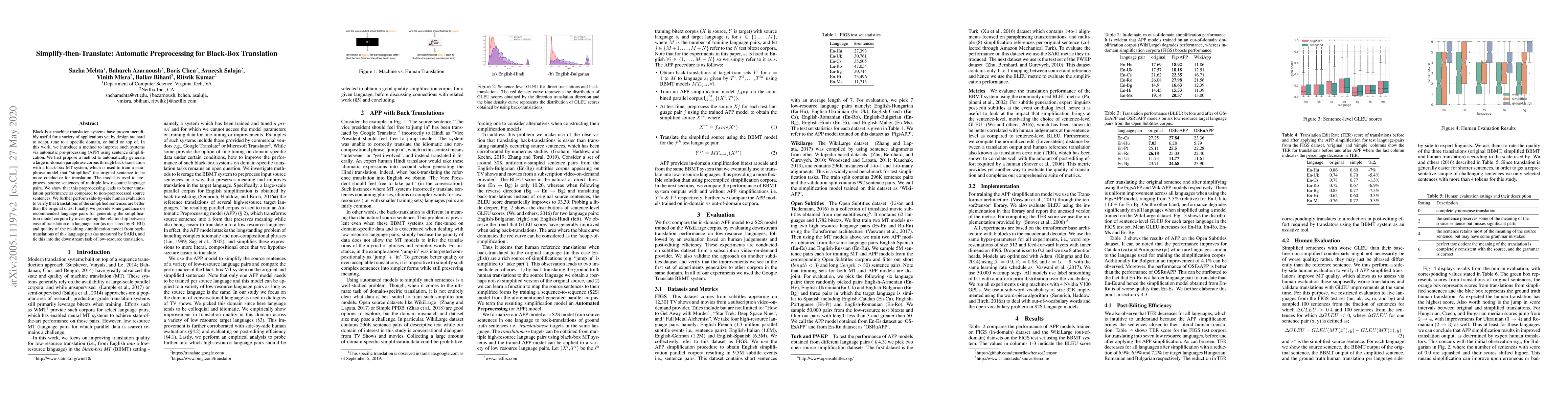 The paper introduces an automatic pre-processing method that simplifies sentences before translation, improving the performance of black-box machine translation systems, especially for low-resource languages. Human evaluations confirm that translating simplified sentences yields better results than using original sentences.