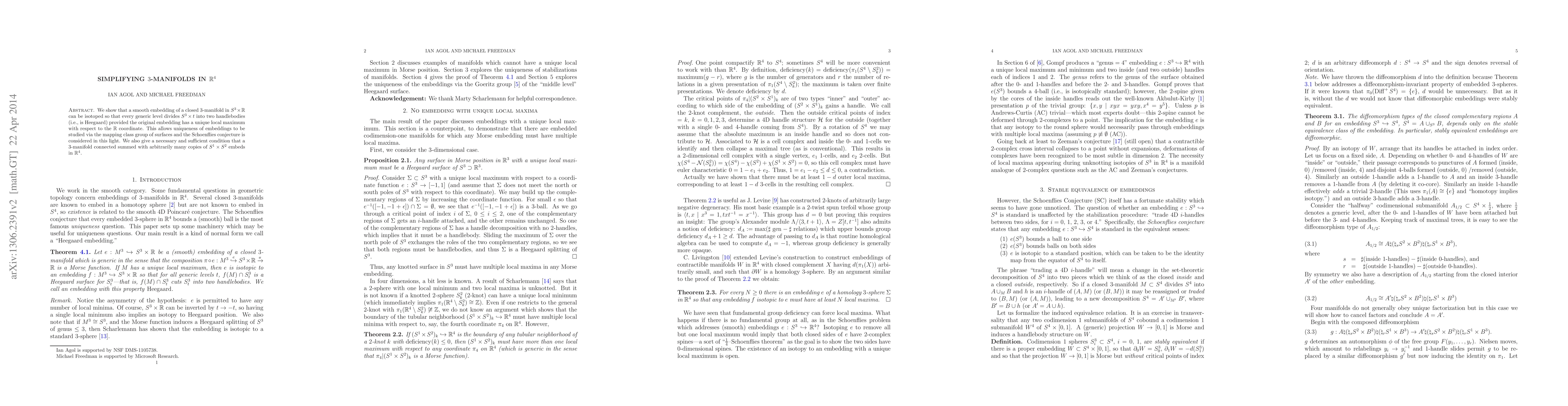 We show that a smooth embedding of a closed 3-manifold in S^3 x R can be isotoped so that every generic level divides S^3 x t into two handlebodies (i.e., is Heegaard) provided the original embedding has a unique local maximum with respect to the R coordinate. This allows uniqueness of embeddings to be studied via the mapping class group of surfaces and the Schoenflies conjecture is considered in this light. We also give a necessary and sufficient condition that a 3-manifold connected summed with arbitrarily many copies of S^1 x S^2 embeds in R^4.