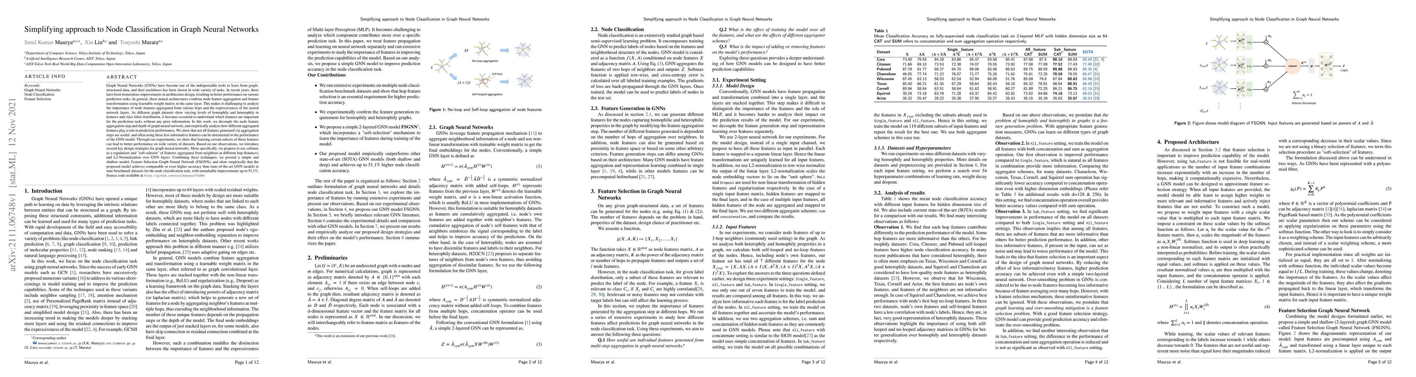 This paper proposes a simplified approach to node classification in Graph Neural Networks (GNN) by decoupling feature aggregation and feature transformation. The authors introduce a model, Feature Selection Graph Neural Network (FSGNN), which uses softmax and L2-normalization to select informative features, achieving comparable or superior performance to state-of-the-art GNN models on nine benchmark datasets.