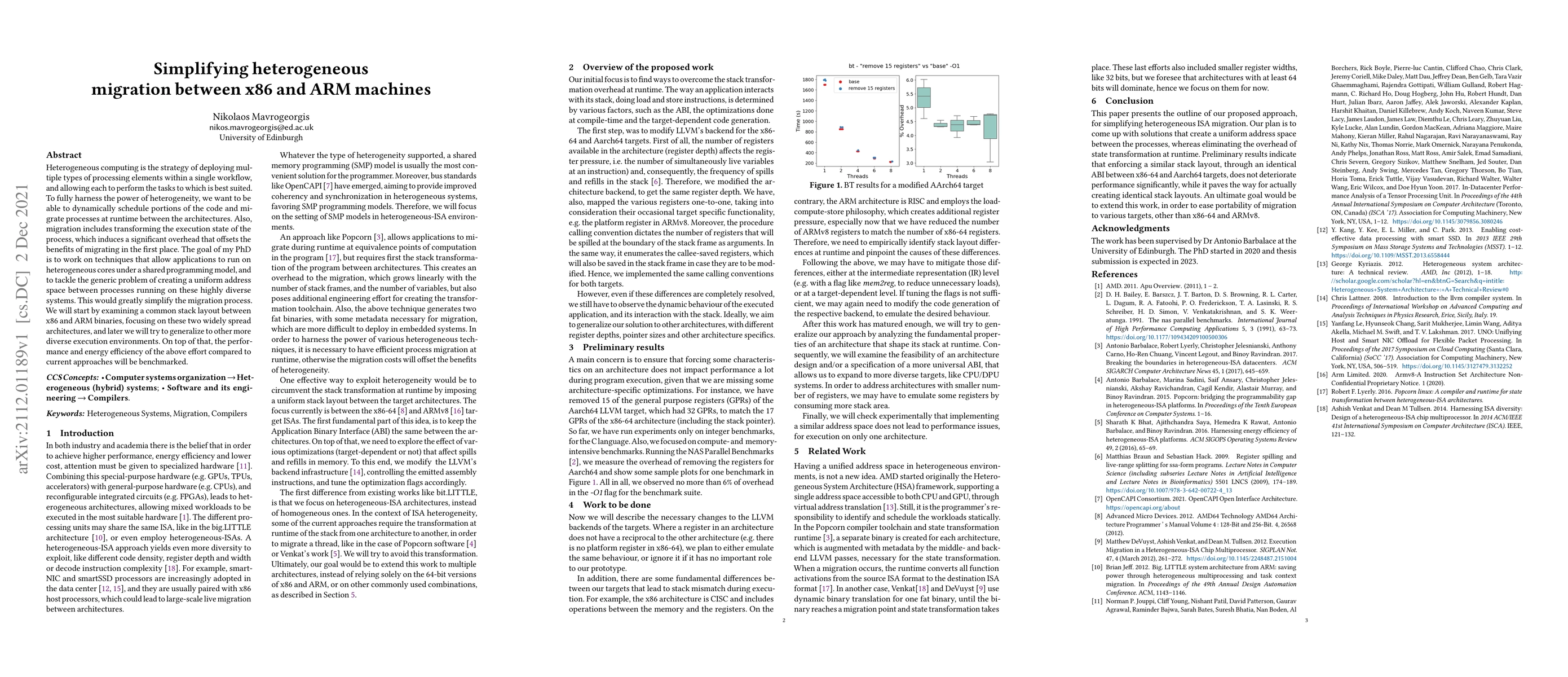 This paper explores techniques to simplify the migration of processes between x86 and ARM architectures, aiming to reduce the overhead of transforming execution states. The research focuses on creating a uniform address space and will initially benchmark performance and energy efficiency against current methods.