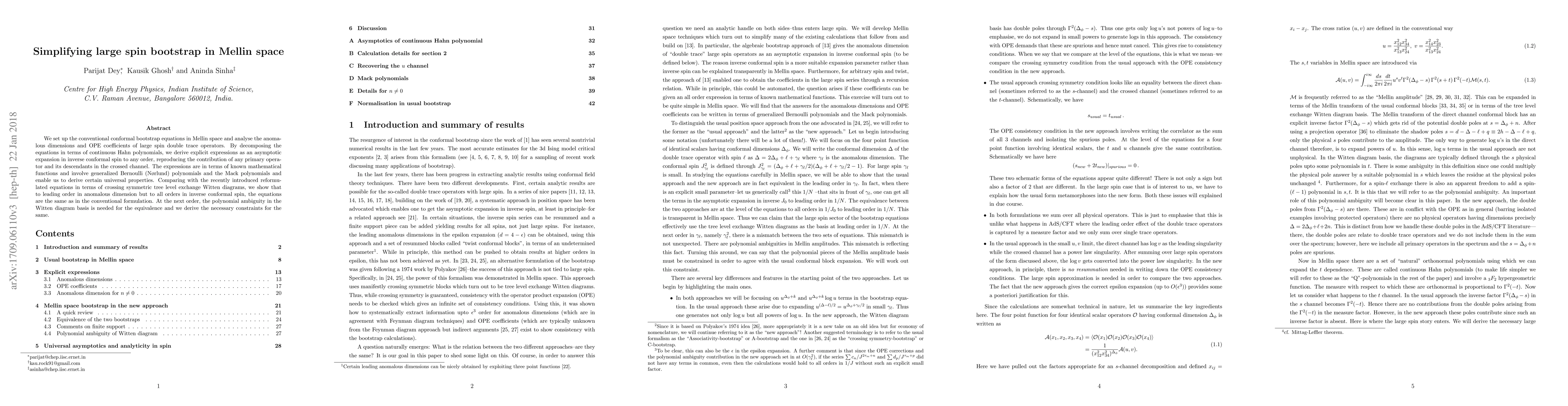 We set up the conventional conformal bootstrap equations in Mellin space and analyse the anomalous dimensions and OPE coefficients of large spin double trace operators. By decomposing the equations in terms of continuous Hahn polynomials, we derive explicit expressions as an asymptotic expansion in inverse conformal spin to any order, reproducing the contribution of any primary operator and its descendants in the crossed channel. The expressions are in terms of known mathematical functions and involve generalized Bernoulli (Norlund) polynomials and the Mack polynomials and enable us to derive certain universal properties. Comparing with the recently introduced reformulated equations in terms of crossing symmetric tree level exchange Witten diagrams, we show that to leading order in anomalous dimension but to all orders in inverse conformal spin, the equations are the same as in the conventional formulation. At the next order, the polynomial ambiguity in the Witten diagram basis is needed for the equivalence and we derive the necessary constraints for the same.