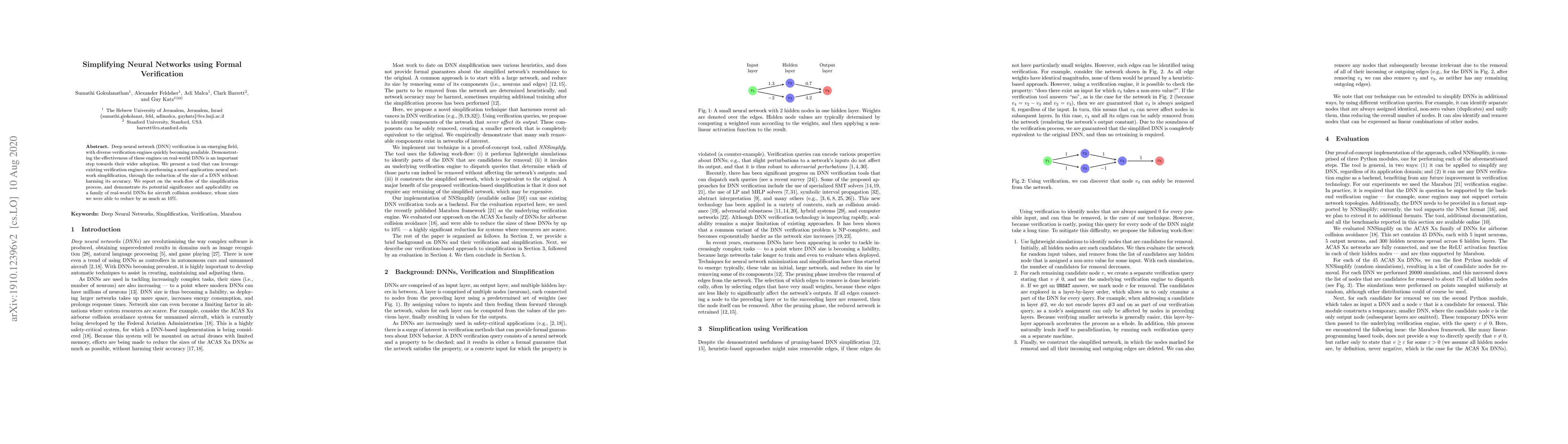 Deep neural network (DNN) verification is an emerging field, with diverse verification engines quickly becoming available. Demonstrating the effectiveness of these engines on real-world DNNs is an important step towards their wider adoption. We present a tool that can leverage existing verification engines in performing a novel application: neural network simplification, through the reduction of the size of a DNN without harming its accuracy. We report on the work-flow of the simplification process, and demonstrate its potential significance and applicability on a family of real-world DNNs for aircraft collision avoidance, whose sizes we were able to reduce by as much as 10%.