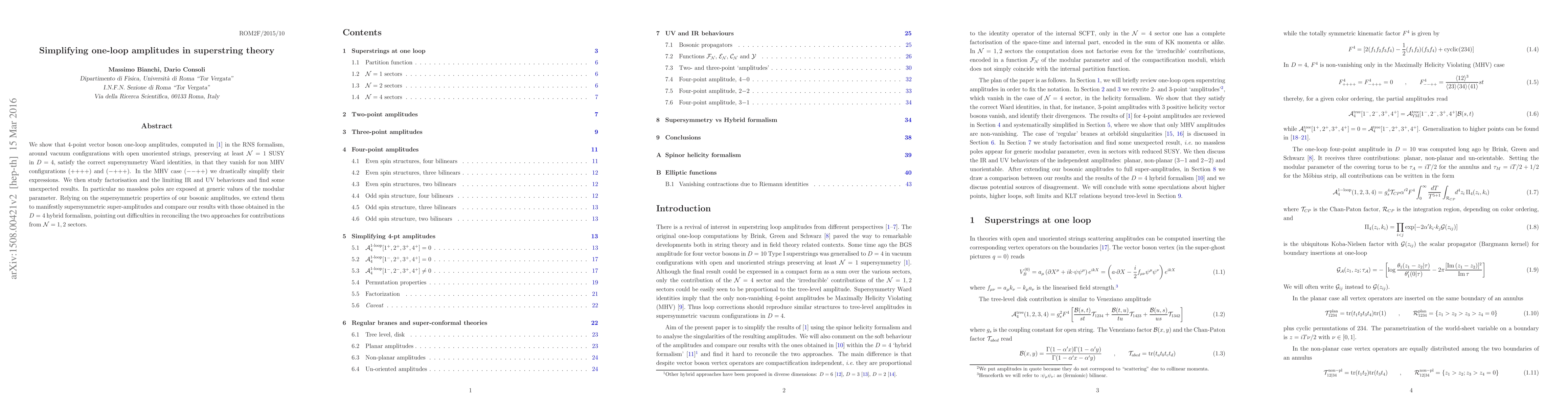 This paper simplifies 4-point vector boson one-loop amplitudes in superstring theory, showing they satisfy supersymmetry Ward identities and drastically simplifying MHV cases. It also investigates factorization and IR/UV behavior, revealing no massless poles at generic values, and compares results with D=4 hybrid formalism, highlighting discrepancies between N=1,2 sectors.