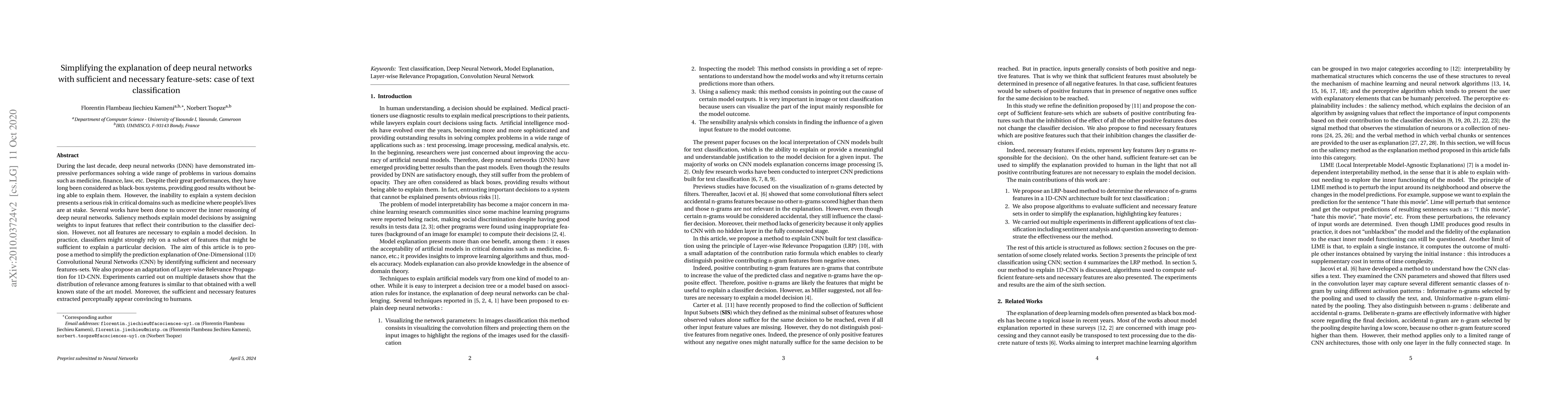 This paper proposes a method to simplify the explanation of deep neural networks in text classification tasks by identifying sufficient and necessary feature sets, demonstrating promising results on multiple datasets.