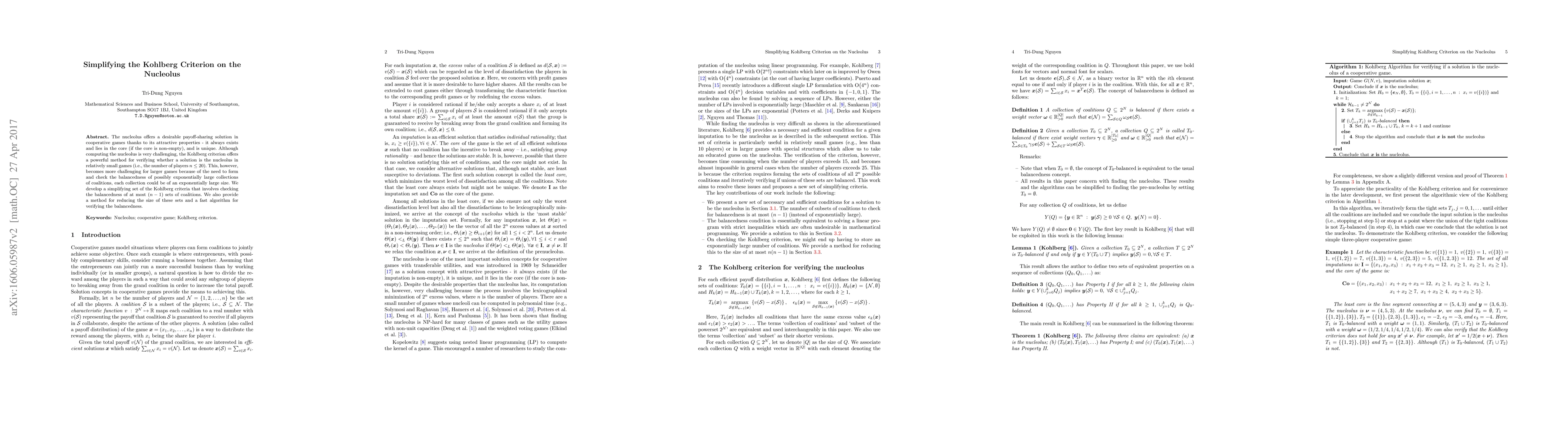 The nucleolus offers a desirable payoff-sharing solution in cooperative games thanks to its attractive properties - it always exists and lies in the core (if the core is non-empty), and is unique. Although computing the nucleolus is very challenging, the Kohlberg criterion offers a powerful method for verifying whether a solution is the nucleolus in relatively small games (i.e., the number of players $n \leq 20$). This, however, becomes more challenging for larger games because of the need to form and check the balancedness of possibly exponentially large sets of coalitions, each set could be of an exponentially large size. We develop a simplifying set of the Kohlberg criteria that involves checking the balancedness of at most $(n-1)$ sets of coalitions. We also provide a method for reducing the size of these sets and a fast algorithm for verifying the balancedness.