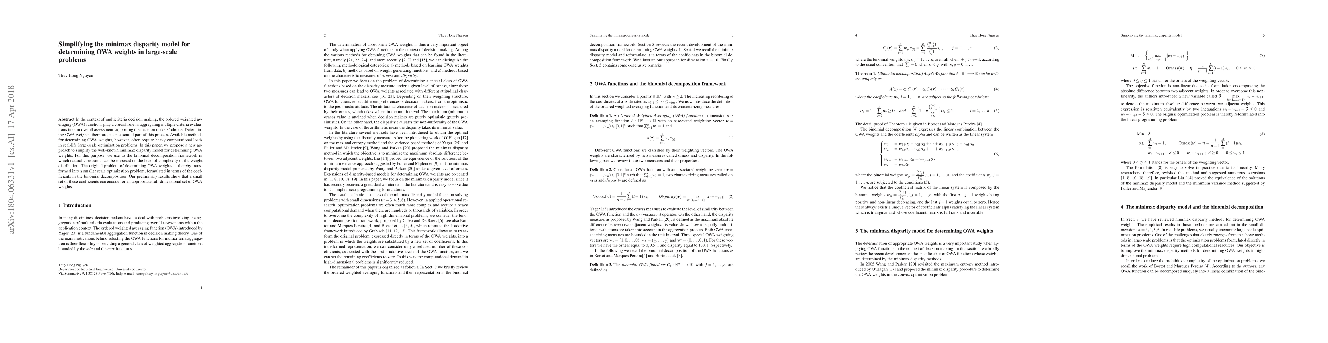 In the context of multicriteria decision making, the ordered weighted averaging (OWA) functions play a crucial role in aggregating multiple criteria evaluations into an overall assessment supporting the decision makers' choice. Determining OWA weights, therefore, is an essential part of this process. Available methods for determining OWA weights, however, often require heavy computational loads in real-life large-scale optimization problems. In this paper, we propose a new approach to simplify the well-known minimax disparity model for determining OWA weights. For this purpose, we use to the binomial decomposition framework in which natural constraints can be imposed on the level of complexity of the weight distribution. The original problem of determining OWA weights is thereby transformed into a smaller scale optimization problem, formulated in terms of the coefficients in the binomial decomposition. Our preliminary results show that a small set of these coefficients can encode for an appropriate full-dimensional set of OWA weights.