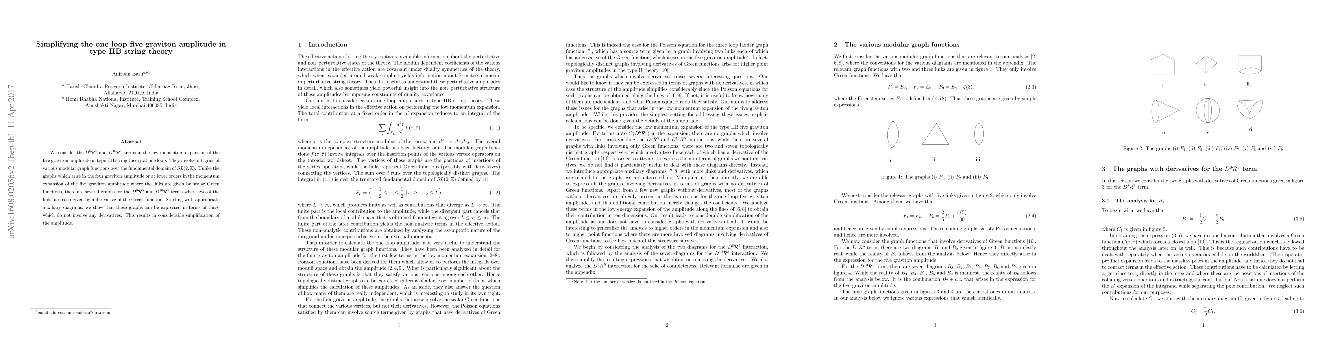 This paper simplifies the one-loop five graviton amplitude in type IIB string theory by expressing complex integrals involving derivatives of the Green function in terms of simpler, non-derivative integrals. This approach significantly reduces the complexity of the calculations.