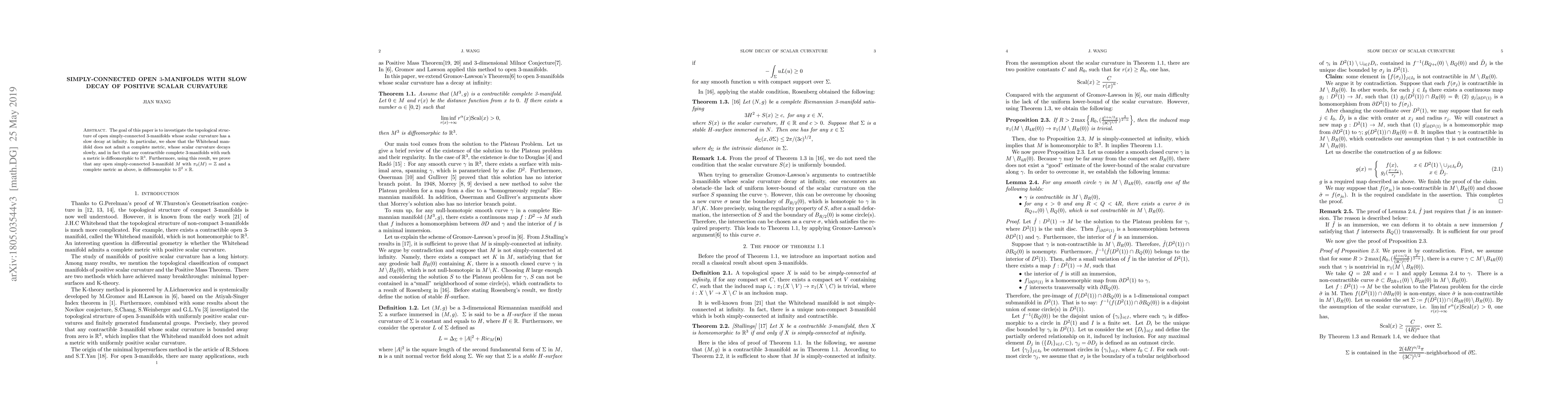 This paper examines the topological properties of open, simply-connected 3-manifolds with slowly decaying positive scalar curvature, proving that the Whitehead manifold cannot support such a metric. It also shows that any contractible 3-manifold with this metric is homeomorphic to $\mathbb{R}^{3}$ and deduces that certain open simply-connected 3-manifolds with $\pi_{2}(M)=\mathbb{Z}$ and a complete metric are homeomorphic to $\mathbb{S}^{2}\times \mathbb{R}$.