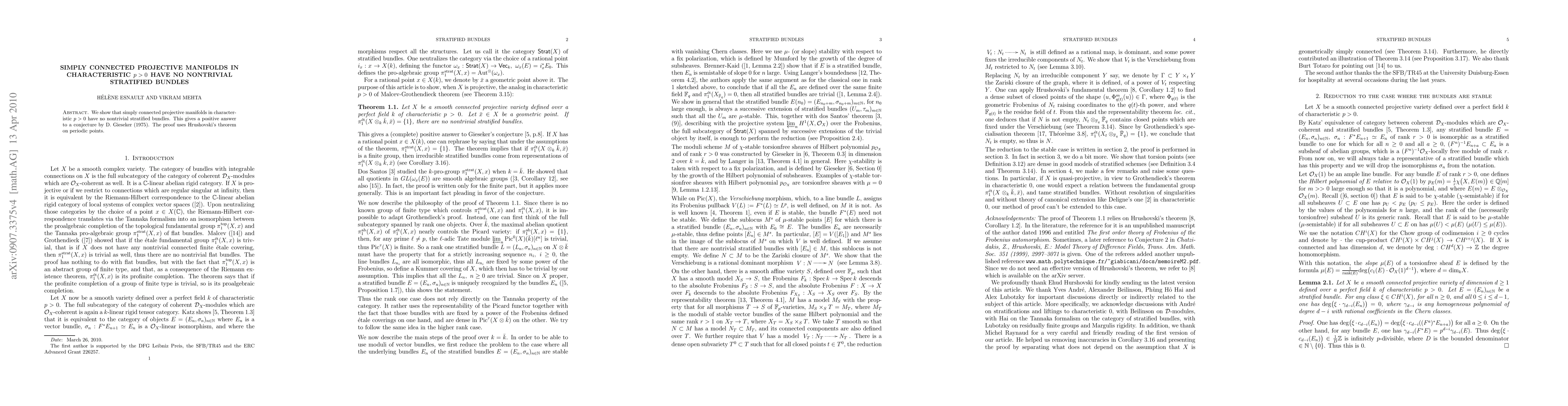 Summary: This research demonstrates that simply connected projective manifolds in fields of characteristic $p>0$ lack nontrivial stratified bundles, providing a solution to a conjecture by D. Gieseker. The proof leverages Hrushovski's theorem on periodic points.