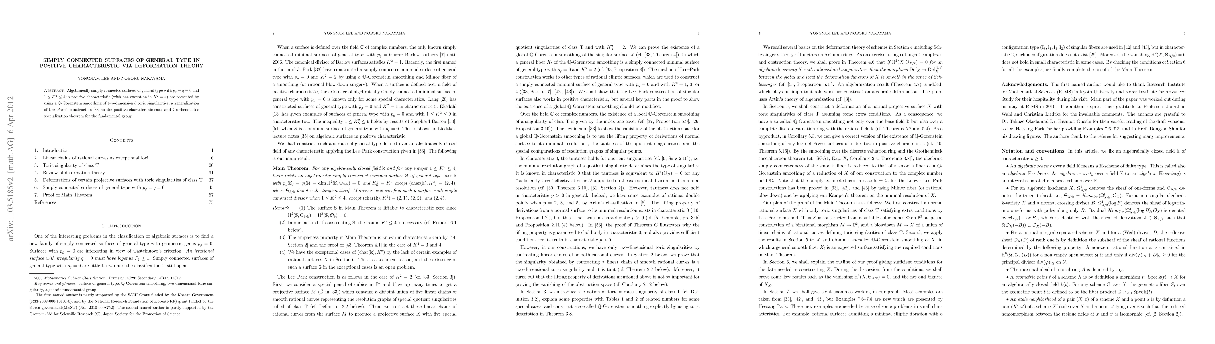 Algebraically simply connected surfaces of general type with p_g=q=0 and 1\le K^2\le 4 in positive characteristic (with one exception in K^2=4) are presented by using a Q-Gorenstein smoothing of two-dimensional toric singularities, a generalization of Lee-Park's construction in the field of complex numbers to the positive characteristic case, and Grothendieck's specialization theorem for the fundamental group.