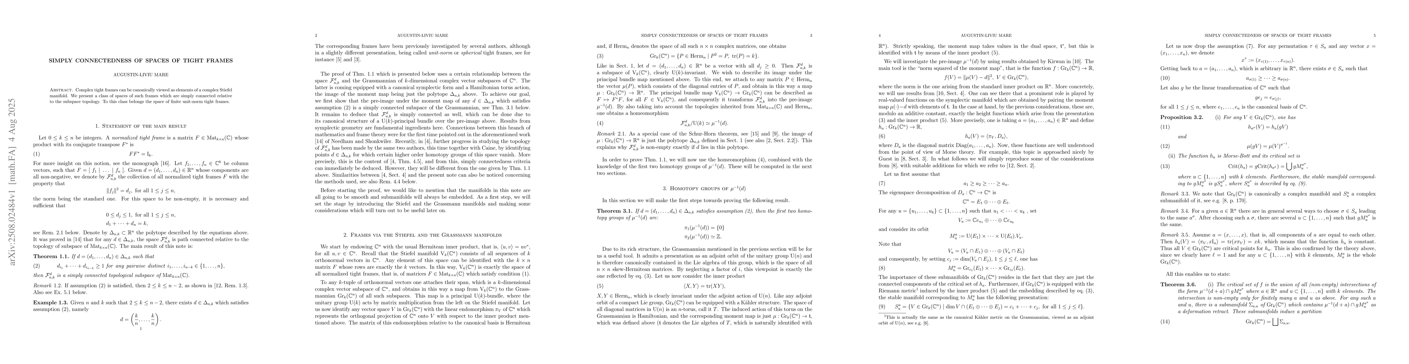 Complex tight frames can be canonically viewed as elements of a complex Stiefel manifold. We present a class of spaces of such frames which are simply connected relative to the subspace topology. To this class belongs the space of finite unit-norm tight frames.