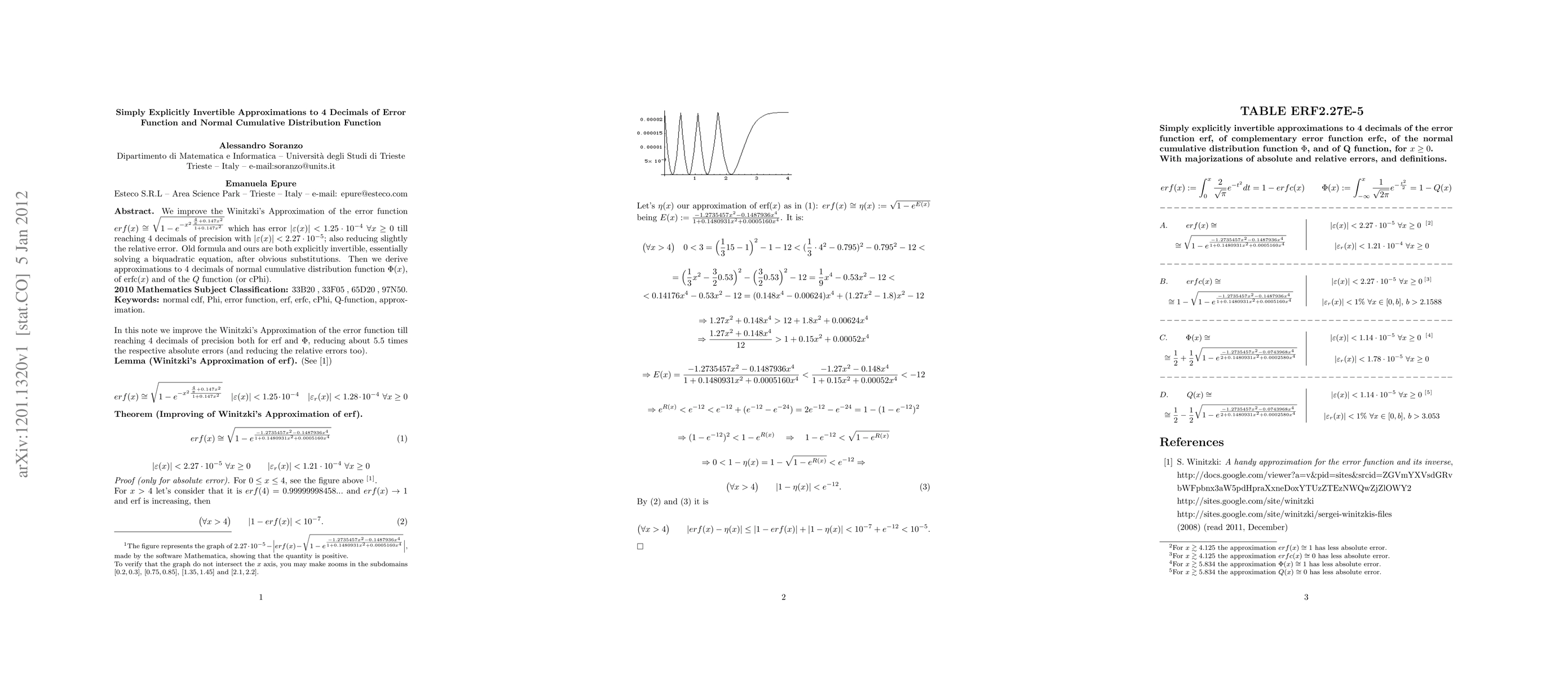 We improve the Modified Winitzki's Approximation of the error function $erf(x)\cong \sqrt{1-e^{-x^2\frac{\frac{4}{\pi}+0.147x^2}{1+0.147x^2}}}$ which has error $|\varepsilon (x)| < 1.25 \cdot 10^{-4}$ $\forall x \ge 0$ till reaching 4 decimals of precision with $|\varepsilon (x)| < 2.27 \cdot 10^{-5}$; also reducing slightly the relative error. Old formula and ours are both explicitly invertible, essentially solving a biquadratic equation, after obvious substitutions. Then we derive approximations to 4 decimals of normal cumulative distribution function $\Phi (x)$, of erfc$(x)$ and of the $Q$ function (or cPhi).